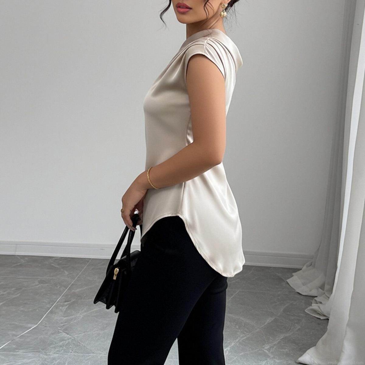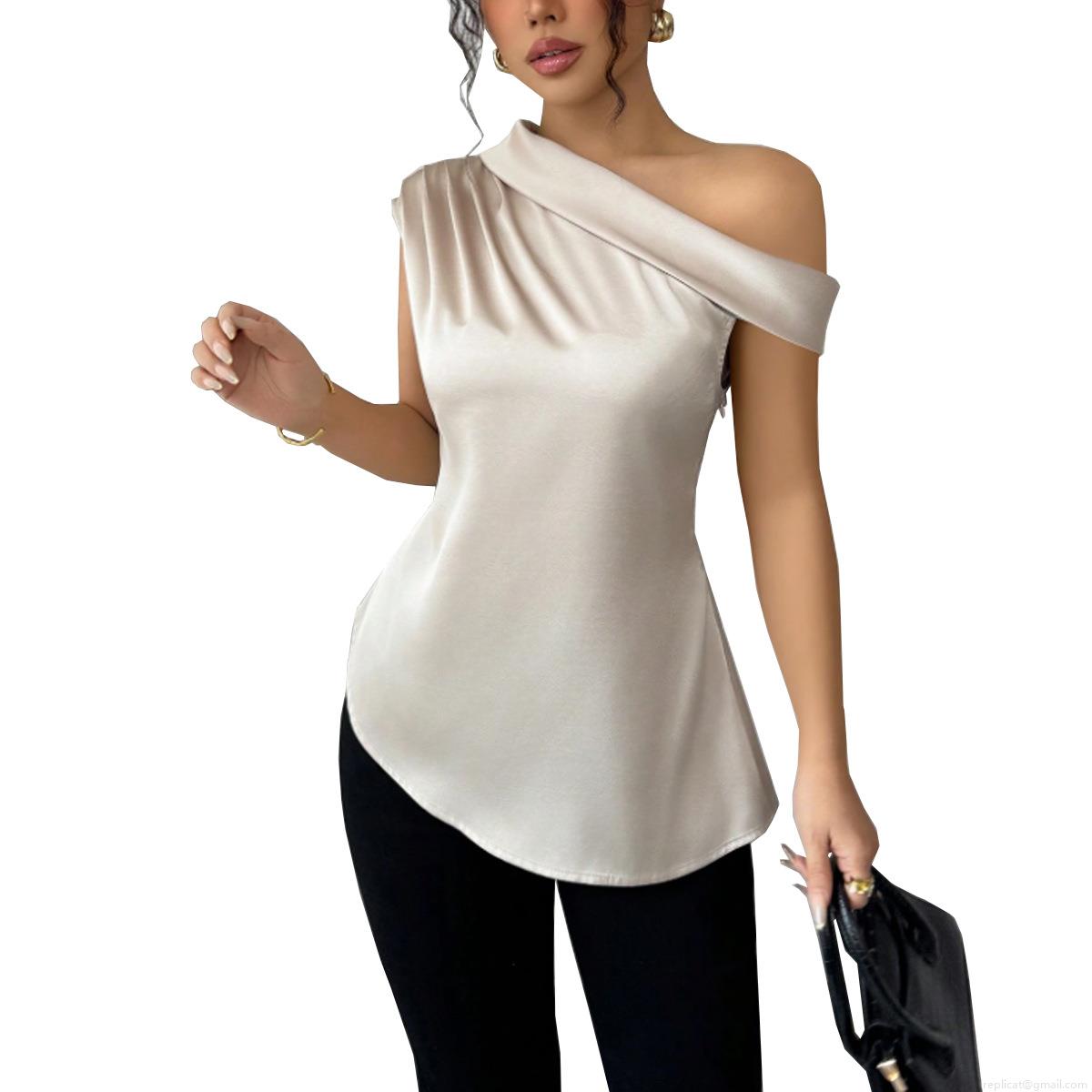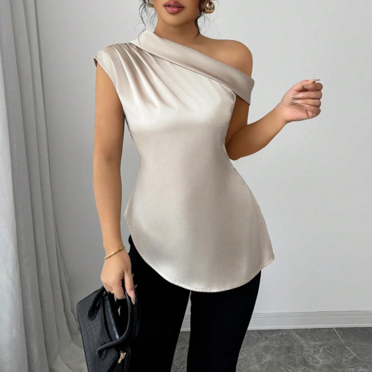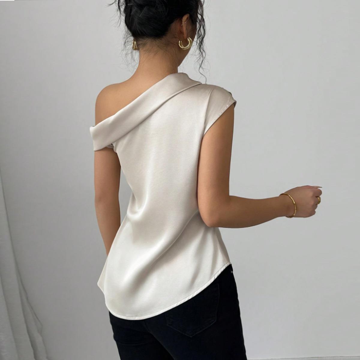 Elegant Women's One Shoulder Satin Top Sleeveless Asymmetrical Ruched Blouse Side Zipper 95% Polyester Champagne Apricot Shirts For Office Party Dating