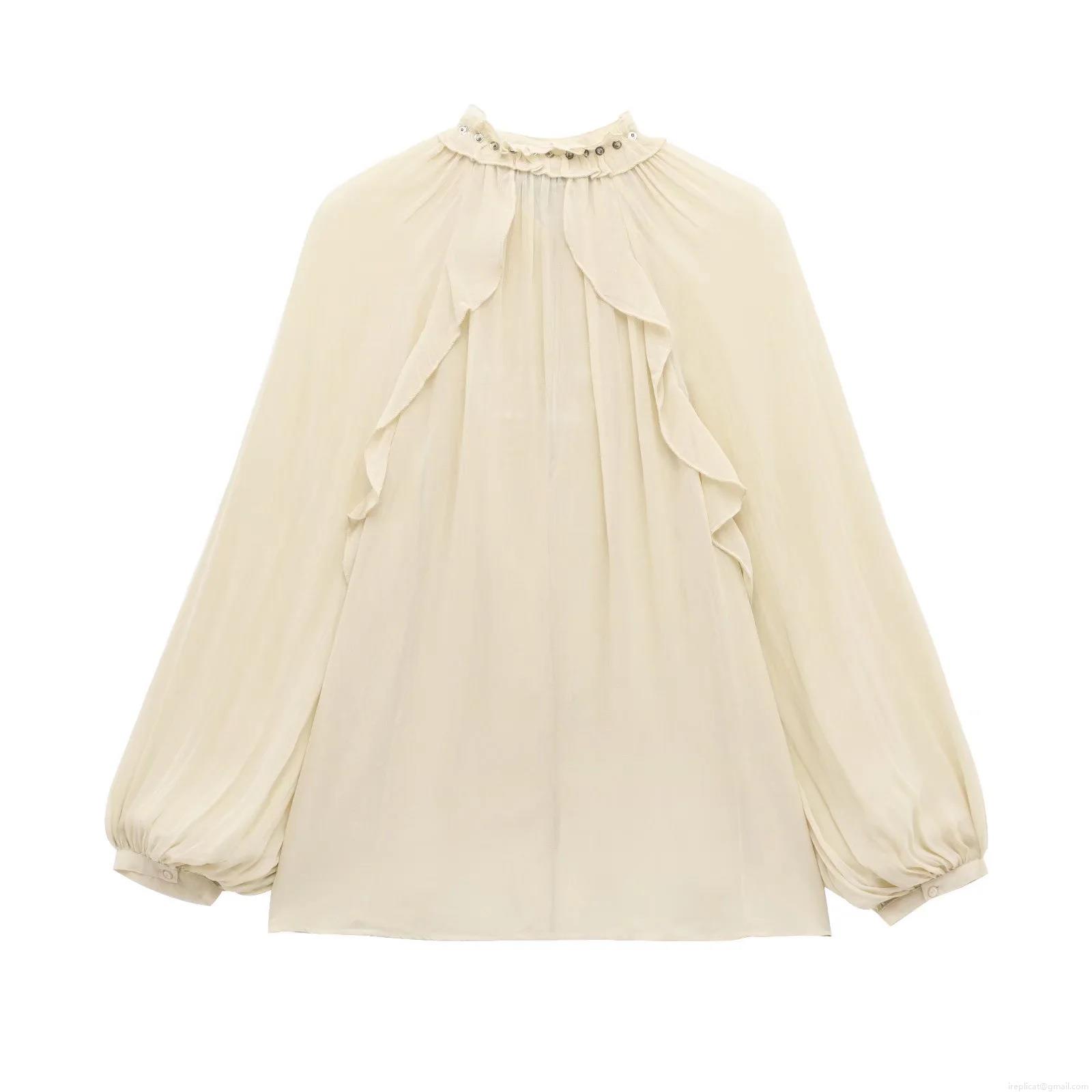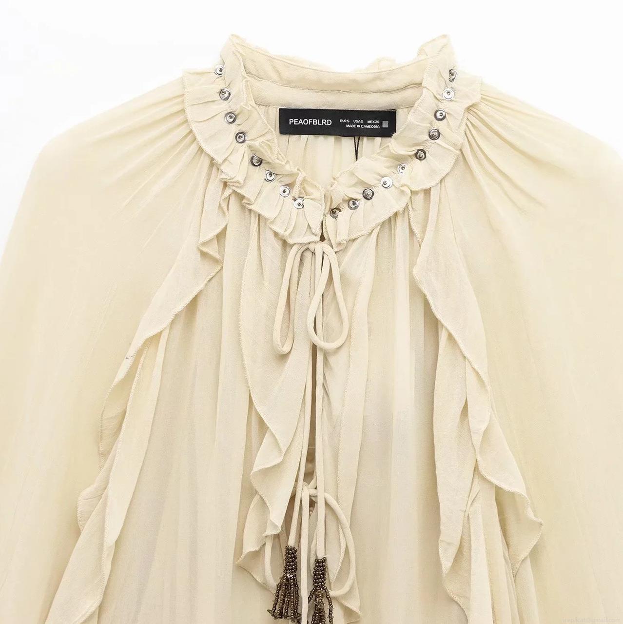 Elegant Women's Ruffled Chiffon Blouse Long Sleeve Retro Solid Color Shirt With Tassel Drawstring And Metallic Rivets Romantic Style Fashion Tops For Women