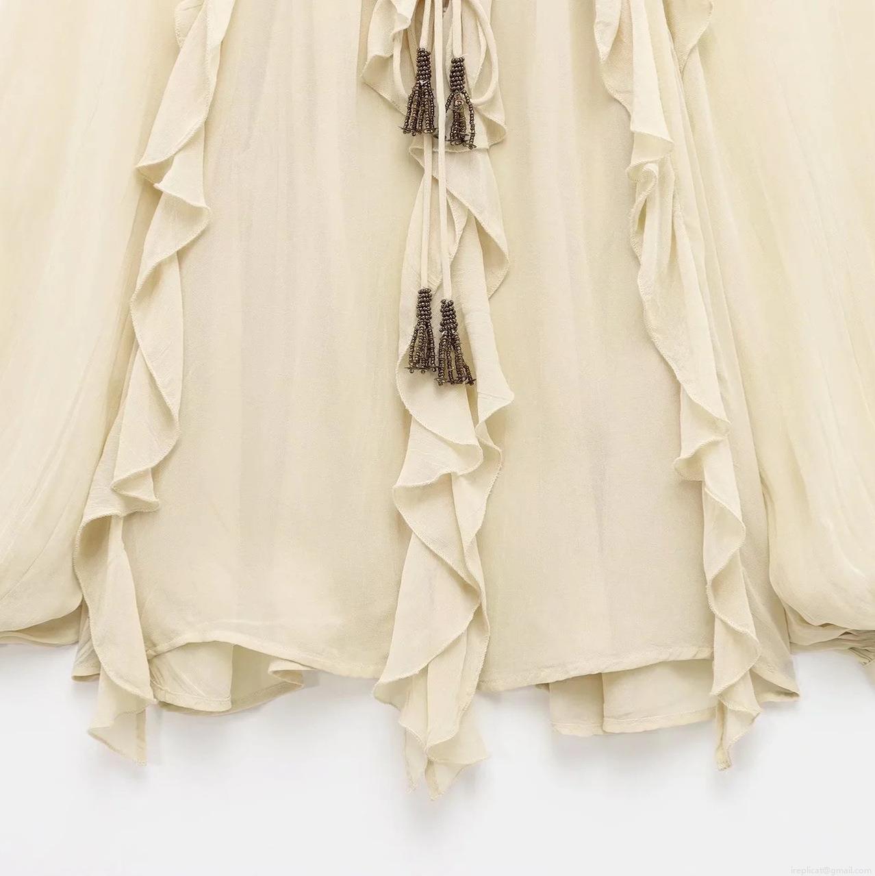 • Elegant Women's Ruffled Chiffon Blouse Long Sleeve Retro Solid Color Shirt With Tassel Drawstring And Metallic Rivets Romantic Style Fashion Tops For Women
