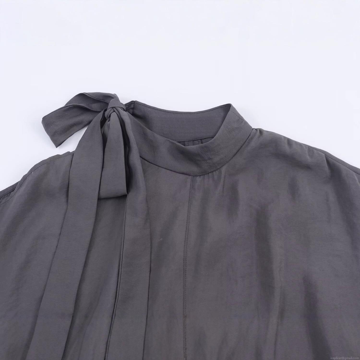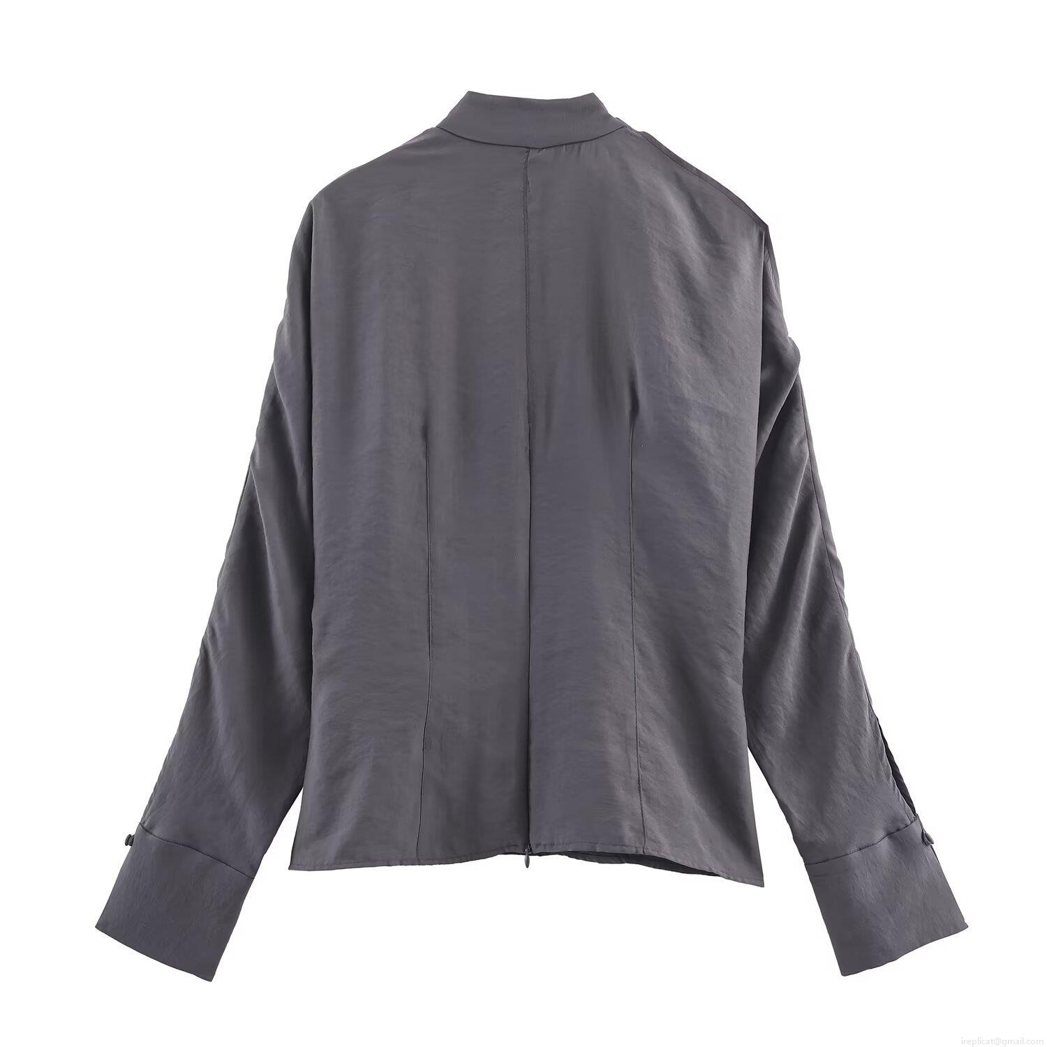 • Elegant Women's Satin Polyester Blouse Featuring Shoulder Slit And Bow Tie Mock Neck Long Sleeve Casual Top For Office Party Dating Grey
