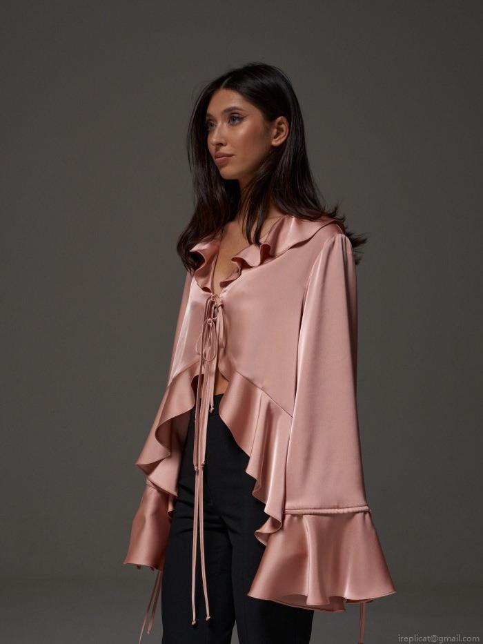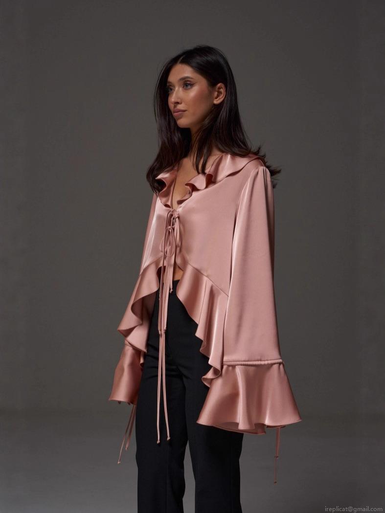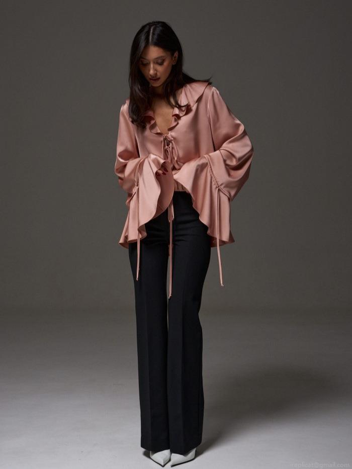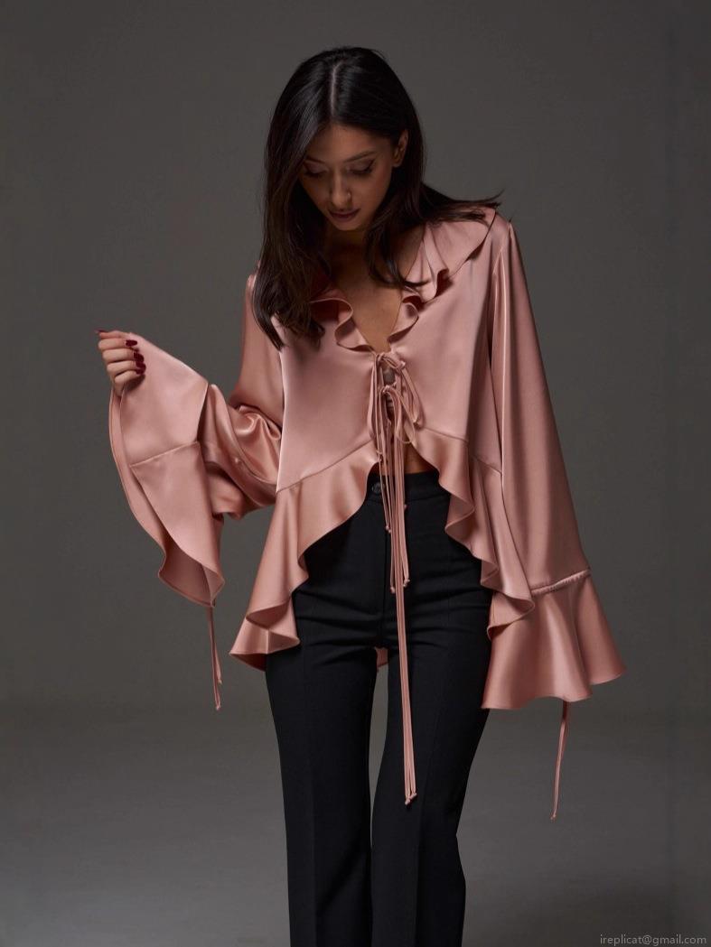 • Elegant Women's Satin Ruffle V-Neck Blouse Silky Champagne Pink Tie Front Shirt With Flare Bell Sleeves Loose Fit Casual Streetwear Top For Party Daily