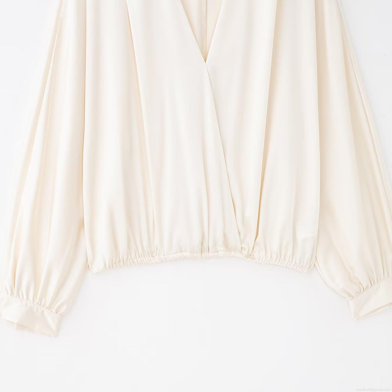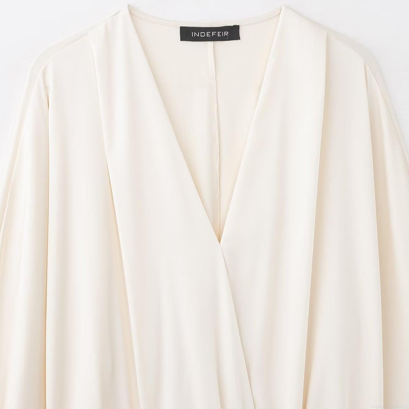 • Elegant Women's Satin V-Neck Blouse Long Sleeve Silk-Like Texture Wrap Shirt With Elastic Hem Fashionable Office Party Casual Tops For Ladies Off-White