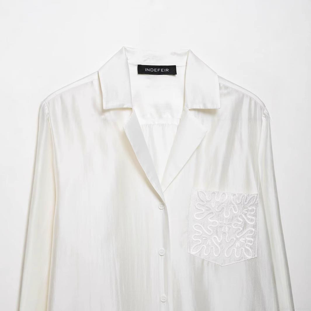 • Elegant Women's Satin White Shirt With Embroidery Pocket Long Sleeve Button Down Blouse For Office Casual Party Lady Tops