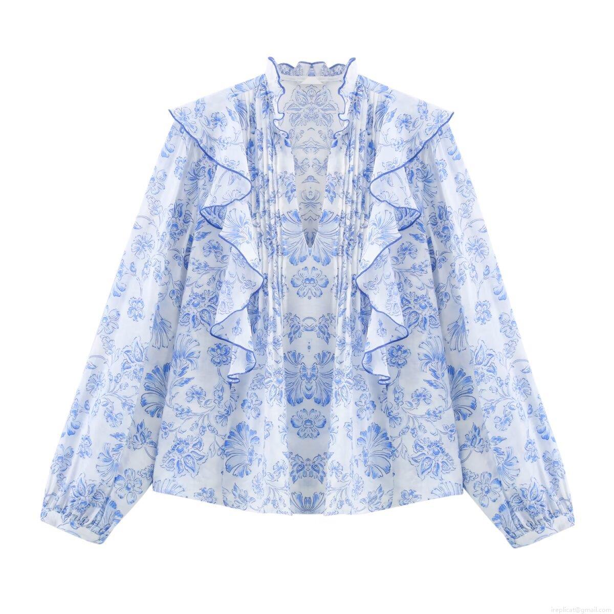 Elegant Women's V-Neck Floral Print Ruffle Blouse Long Sleeve Polyester Tops Casual Office Sweet Shirt For Women