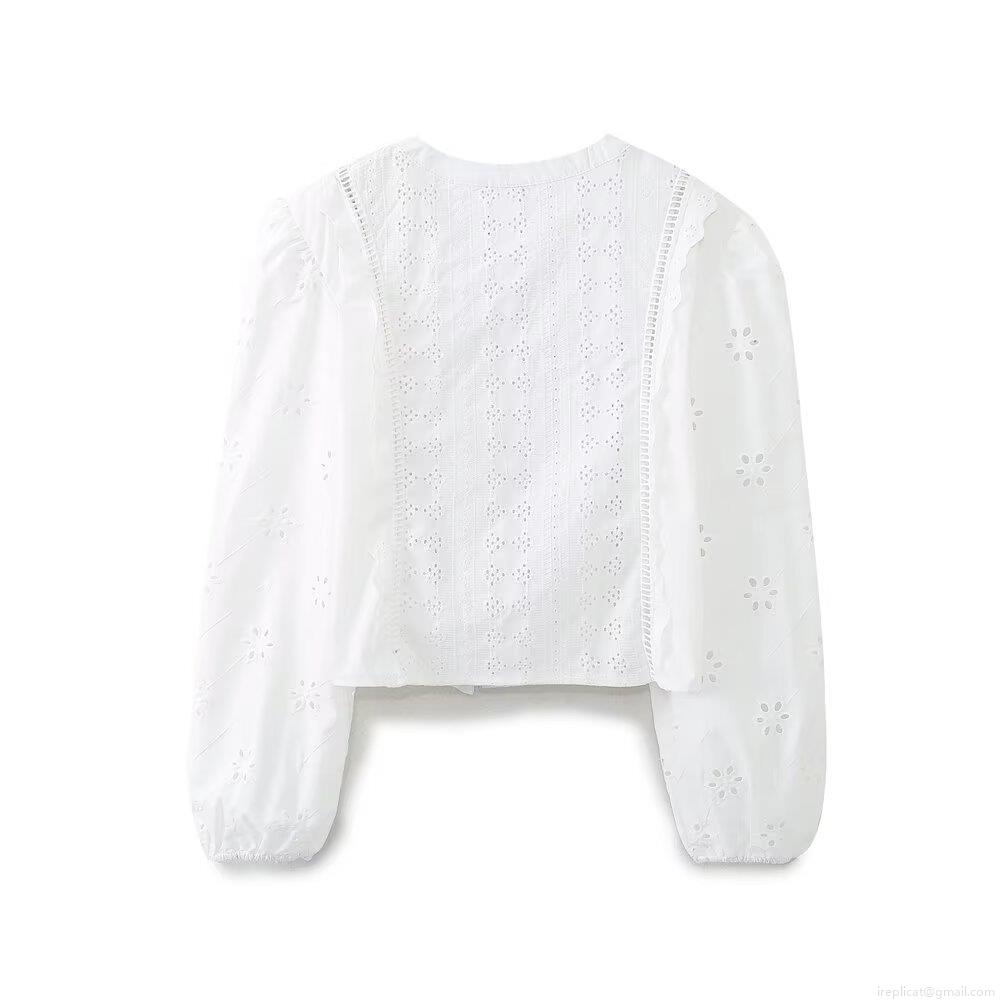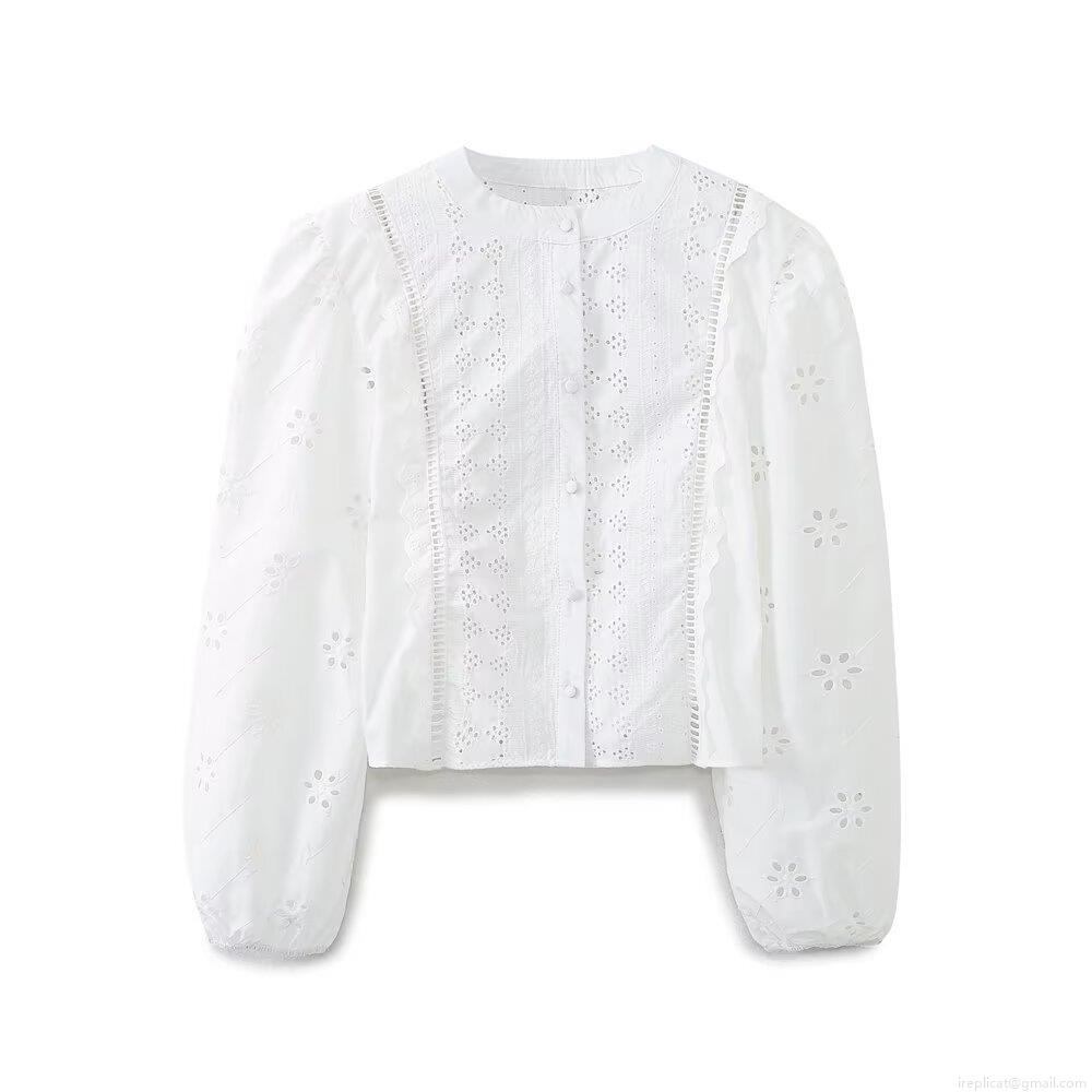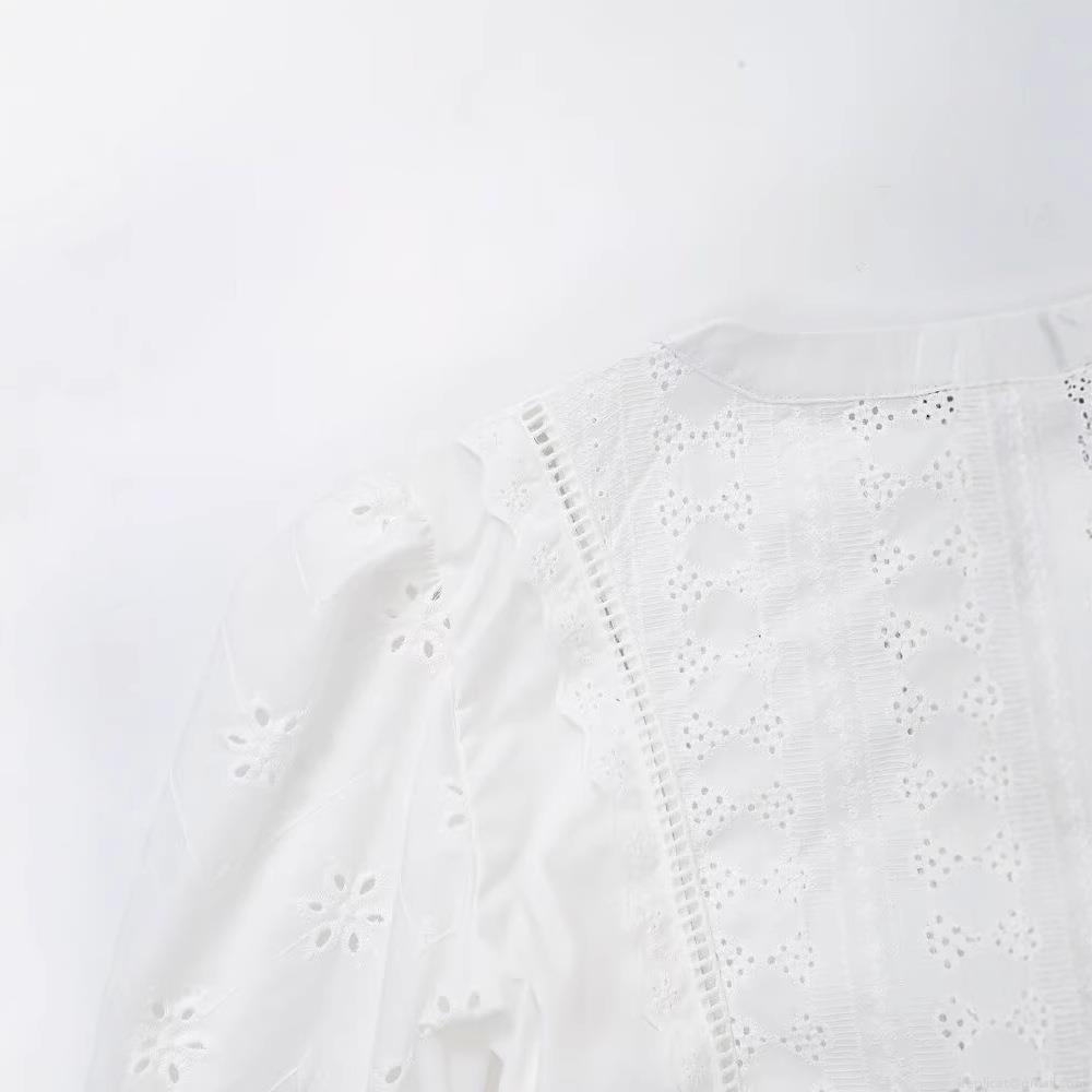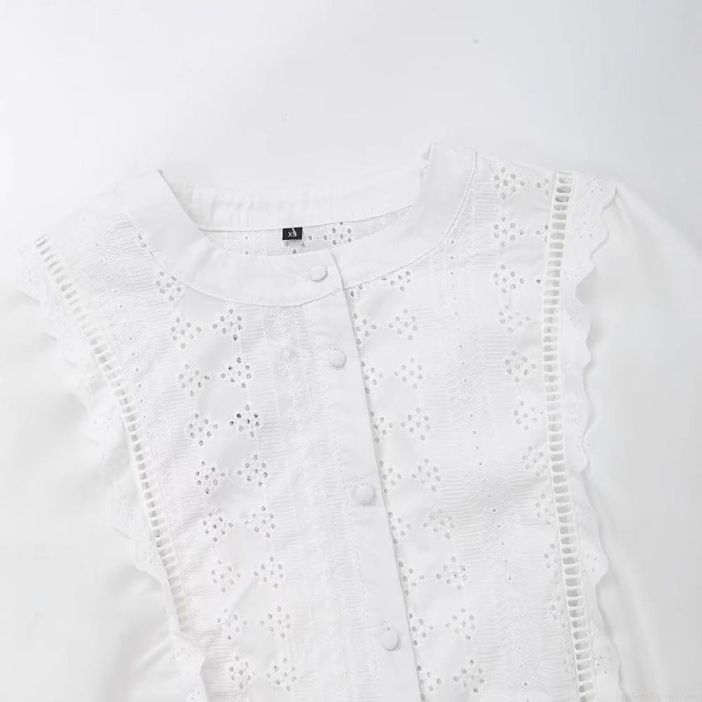 • Elegant Women's White Eyelet Embroidered Blouse 85% Cotton Long Sleeve Round Neck Button Down Shirt Street Style Chic Top for Women
