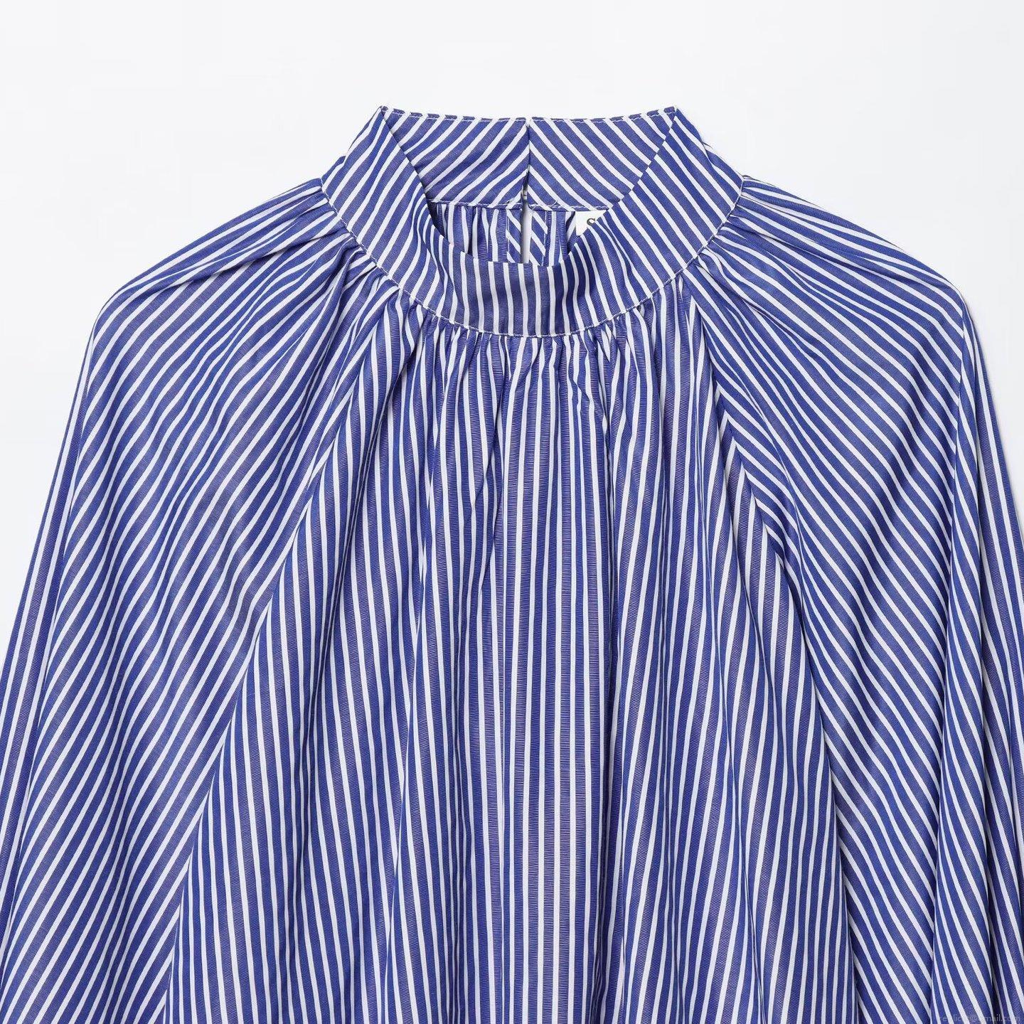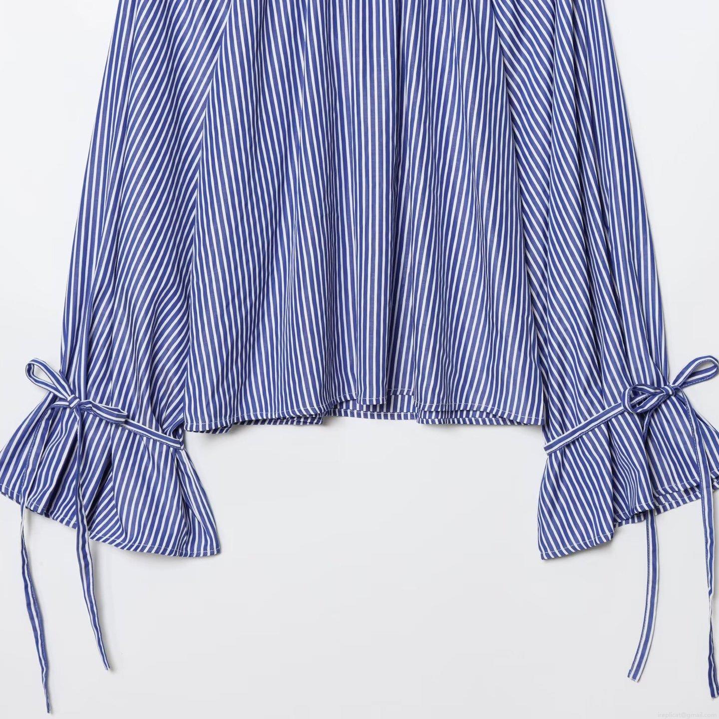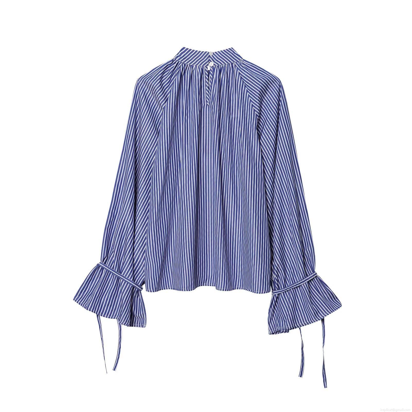• Fashion Striped Shirt Women Stand Collar Flare Sleeve Tie Cuff Pullover Cotton Blend Blouse Casual Office Commuter Loose Long Sleeve Top
