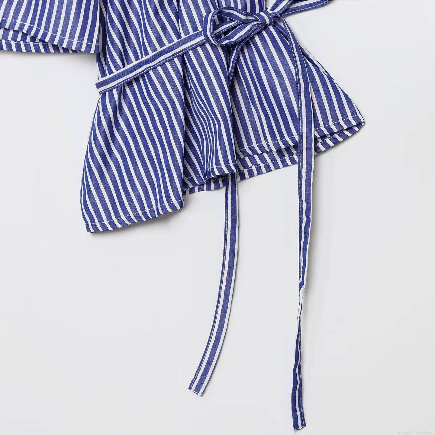 Fashion Striped Shirt Women Stand Collar Flare Sleeve Tie Cuff Pullover Cotton Blend Blouse Casual Office Commuter Loose Long Sleeve Top