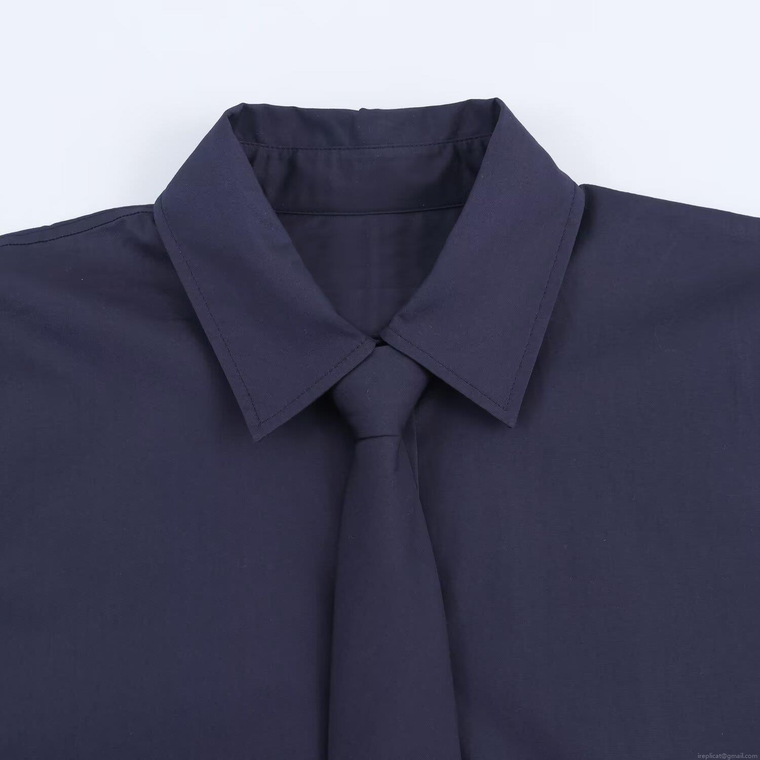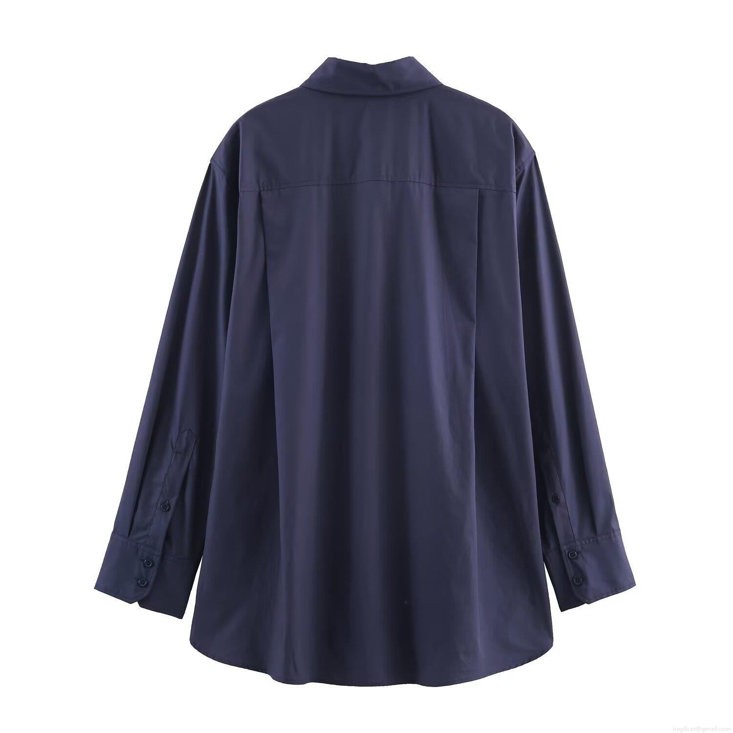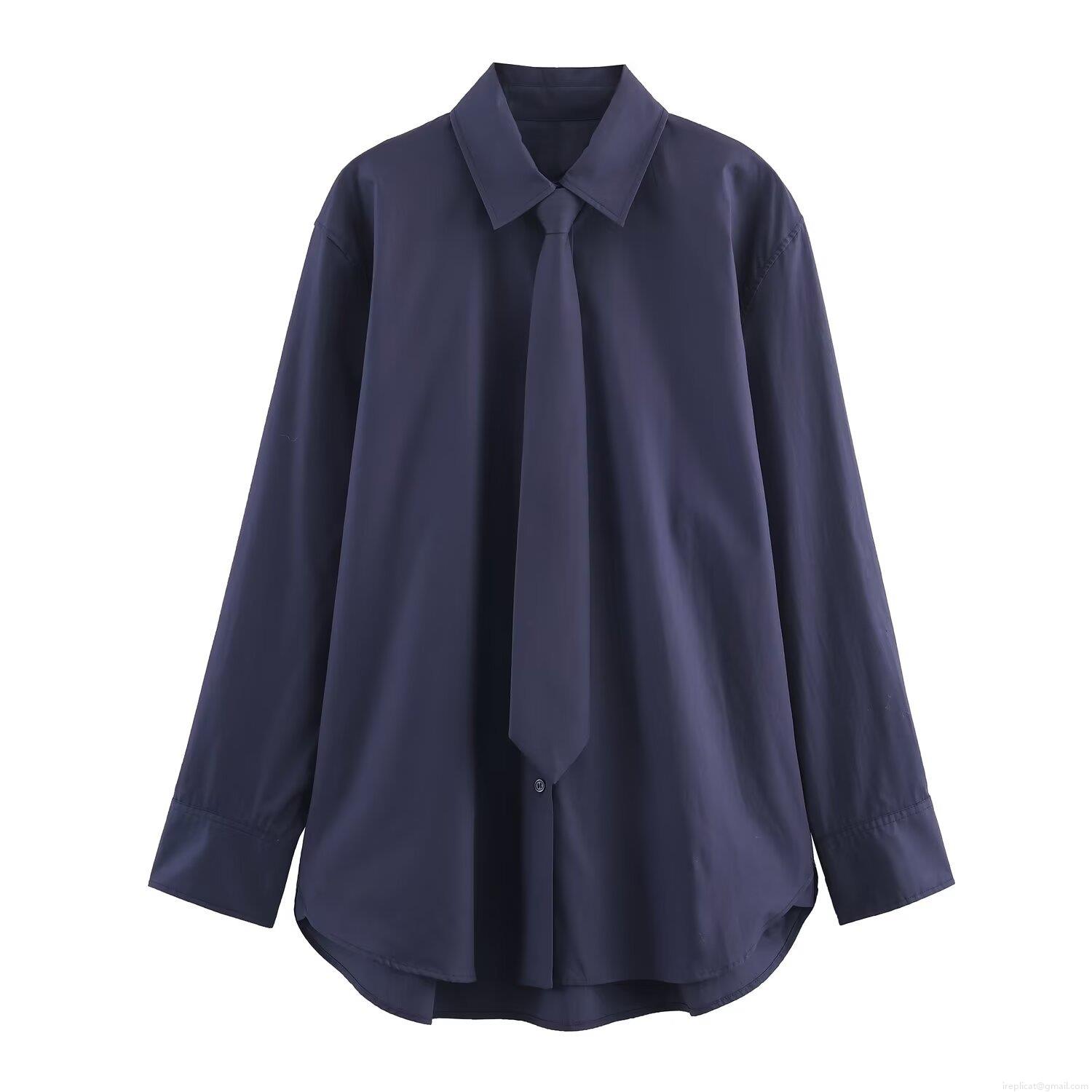 • Fashion Women Long Sleeve Poplin Shirt With Tie Casual Navy Blue Solid Color Turn-down Collar Single-breasted Office Blouse Elegant Tops For Lady