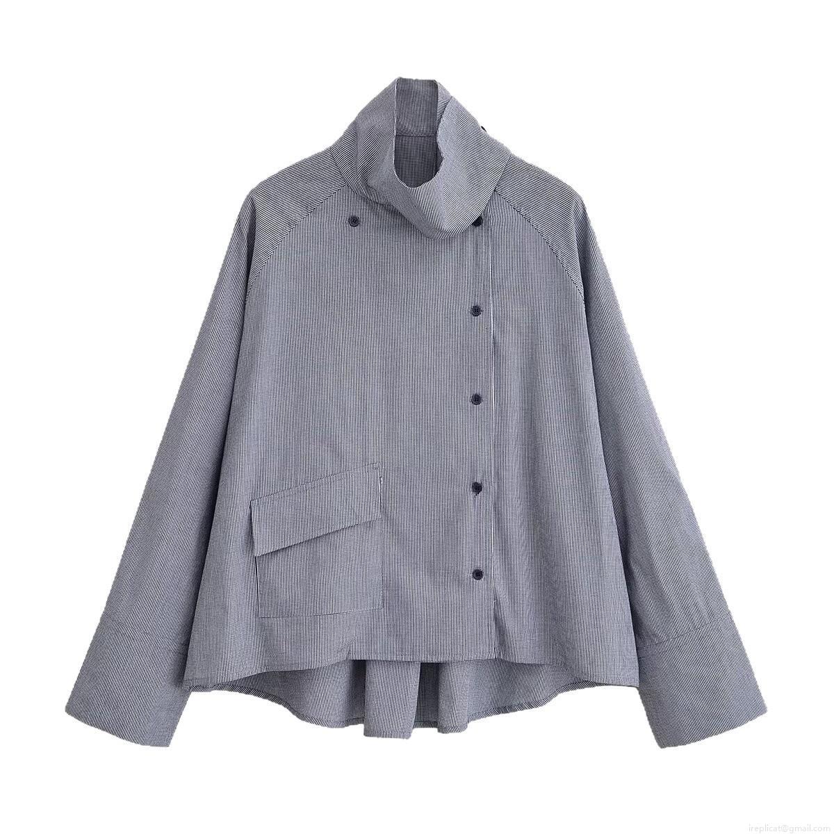 • Fashion Women's High Neck Grid Shirt Casual Long Sleeve Blouse With Side Buttons Large Pocket And Asymmetric Hem Loose Fit Polyester Top For Streetwear