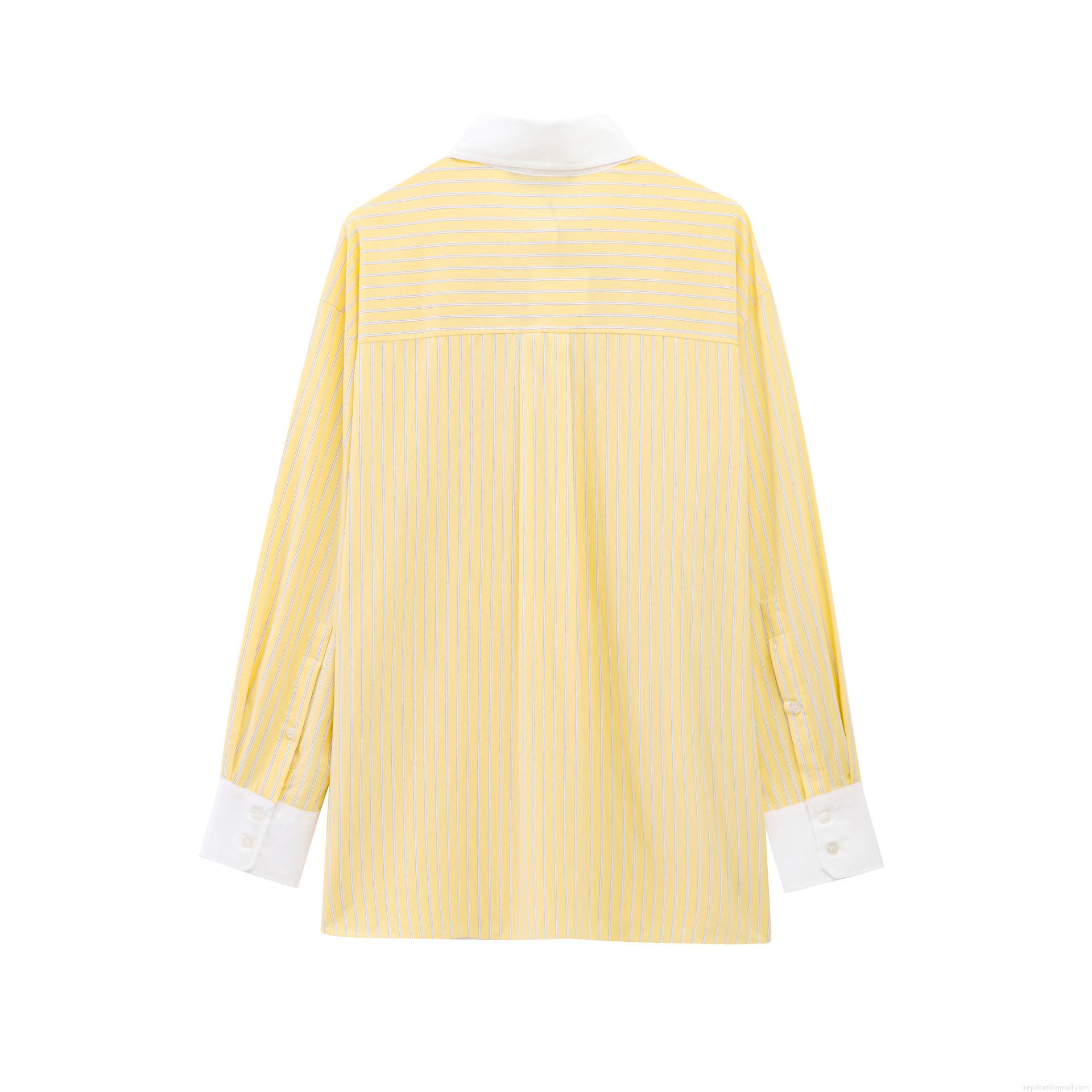 • Fashion Women's Striped Long Sleeve Poplin Shirt Contrast Collar Loose Fit Button Down Blouse Casual Streetwear Office Top Yellow White