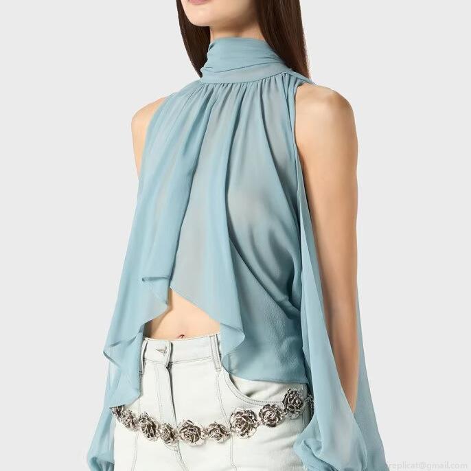 • French Elegant Chiffon Blouse Pleated Sleeveless Halter Top with Back Bow Tie-up Loose Breathable Lightweight Summer Shirt for Women