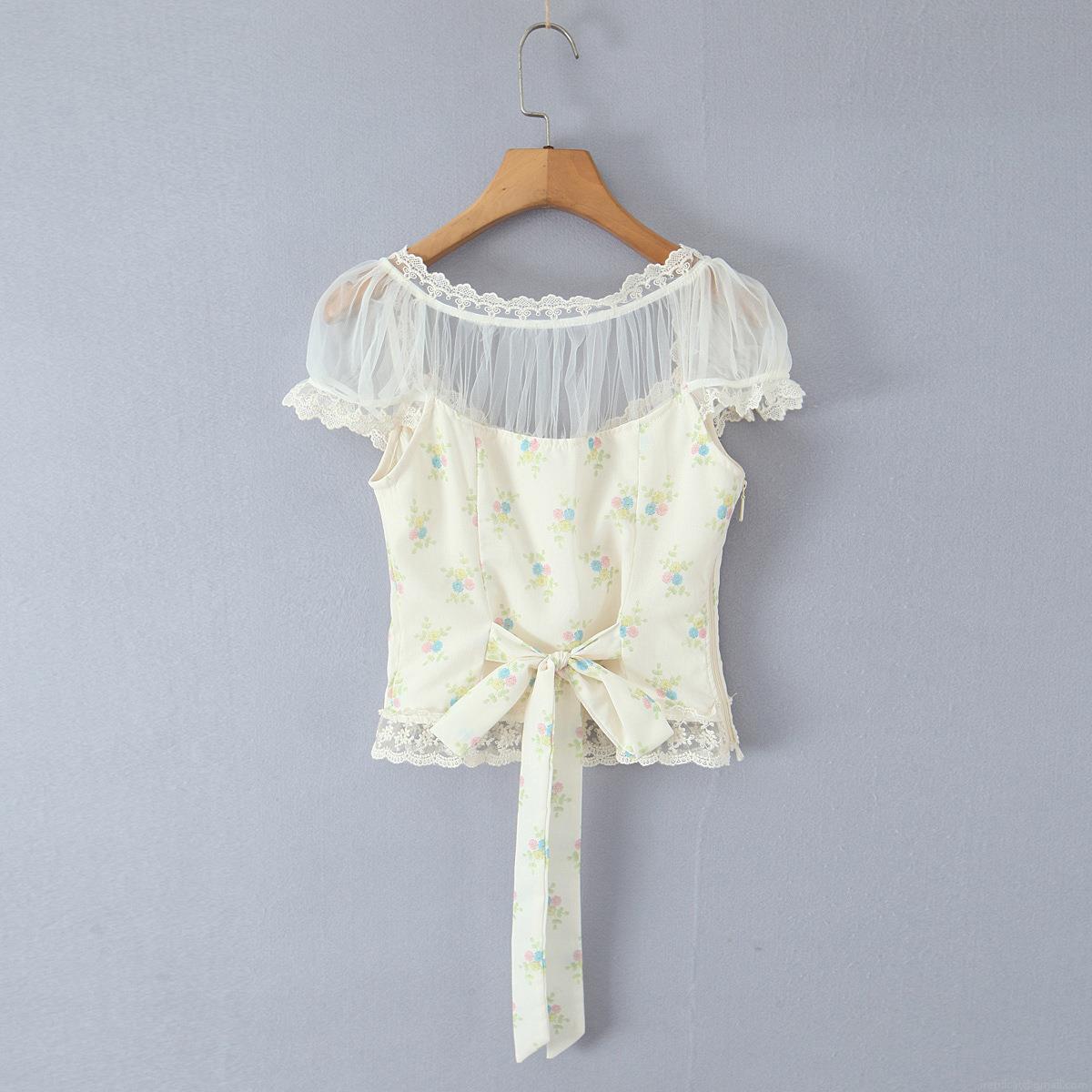 • French Pastoral Floral Lace Chiffon Blouse For Women Square Neck Puff Sleeve Retro Sweet Crop Top Summer Casual Elegant Mesh Stitching Shirt