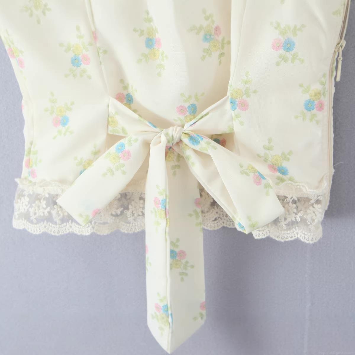 Splice, Bow, Floral Pattern, Printing, Three-dimensional Flowers, Puff Sleeves, Lace, Square Collar