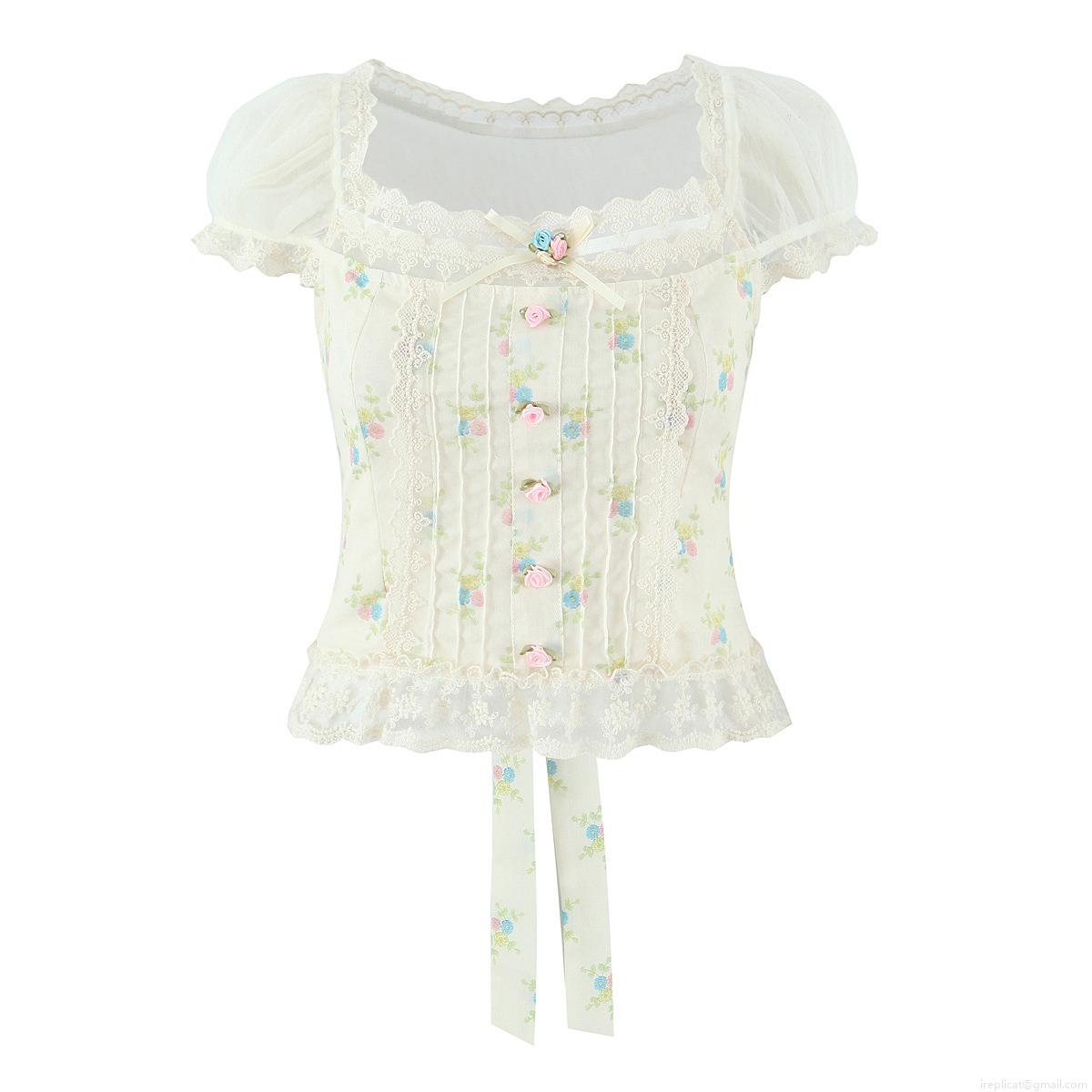 French Pastoral Floral Lace Chiffon Blouse For Women Square Neck Puff Sleeve Retro Sweet Crop Top Summer Casual Elegant Mesh Stitching Shirt
