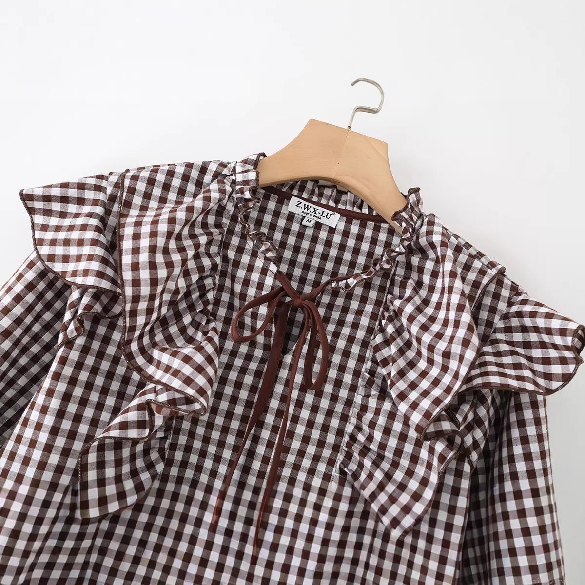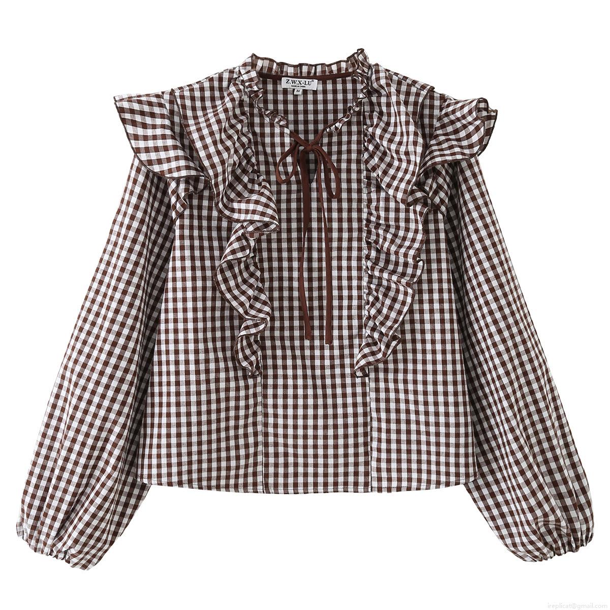 • French Retro Gingham Ruffle Blouse 100% Cotton Long Sleeve Neck Tie Shirt For Women Casual Chic Plaid Streetwear Autumn Tops