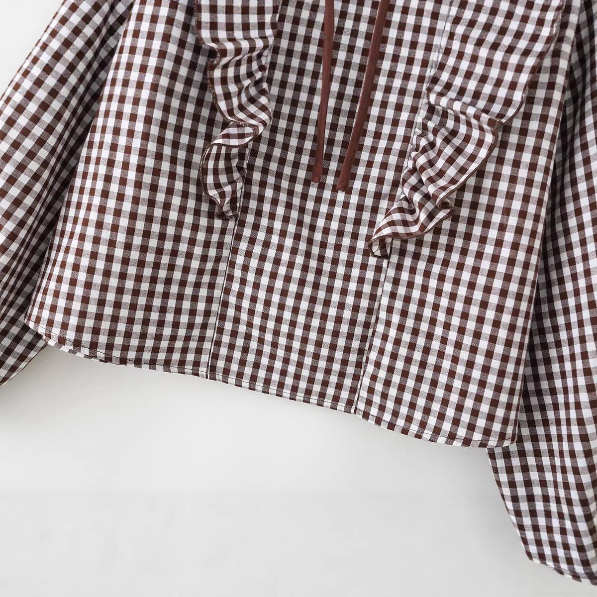 French Retro Gingham Ruffle Blouse 100% Cotton Long Sleeve Neck Tie Shirt For Women Casual Chic Plaid Streetwear Autumn Tops