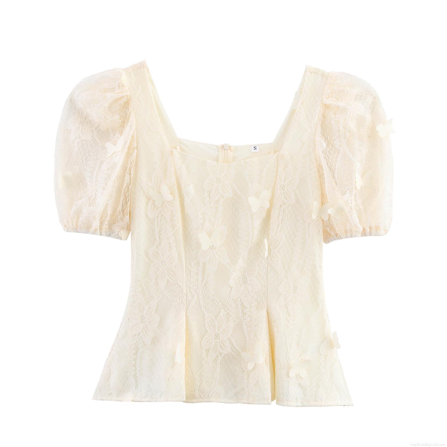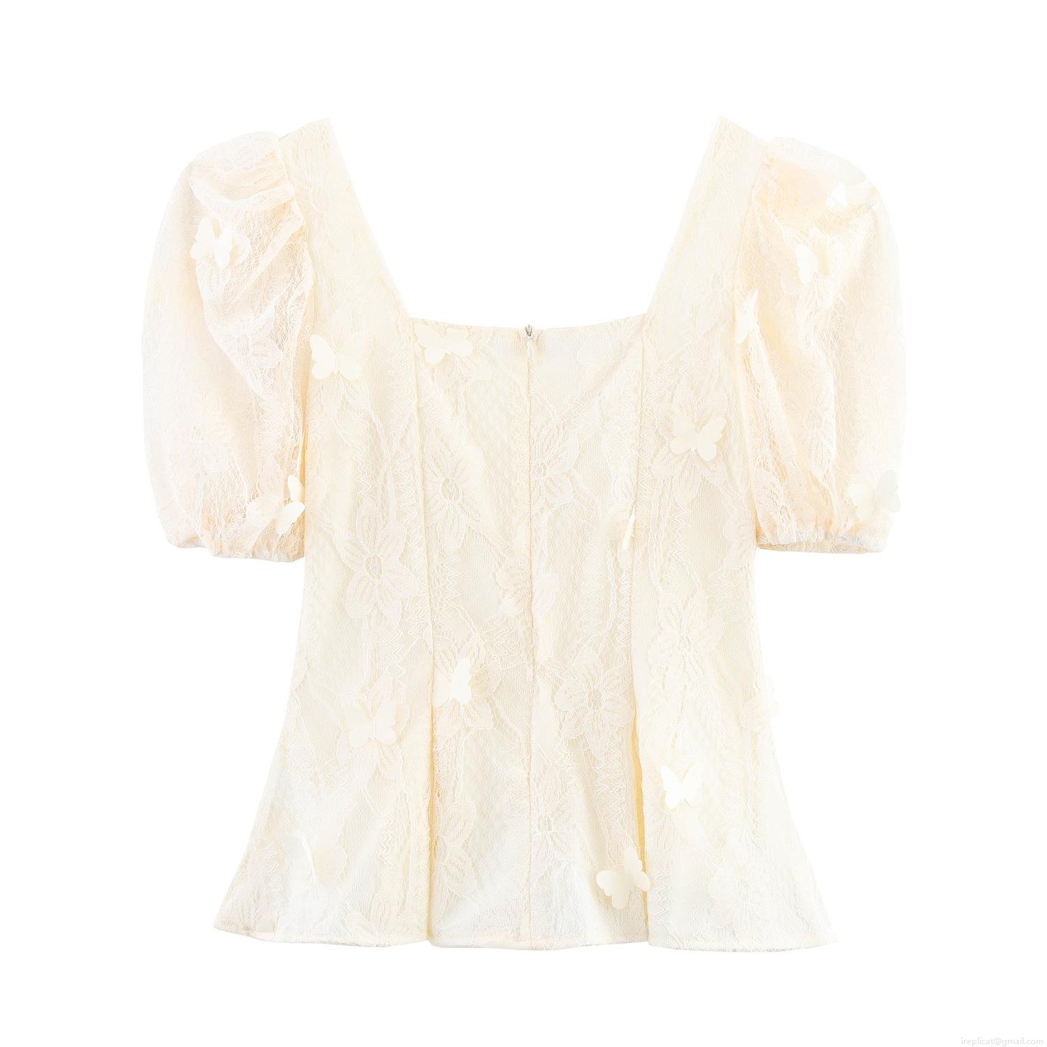 French Retro Lace Blouse With 3D Butterfly Appliques Square Neck Puff Sleeve Mesh Top For Women Sweet Elegant Summer Party Shirt