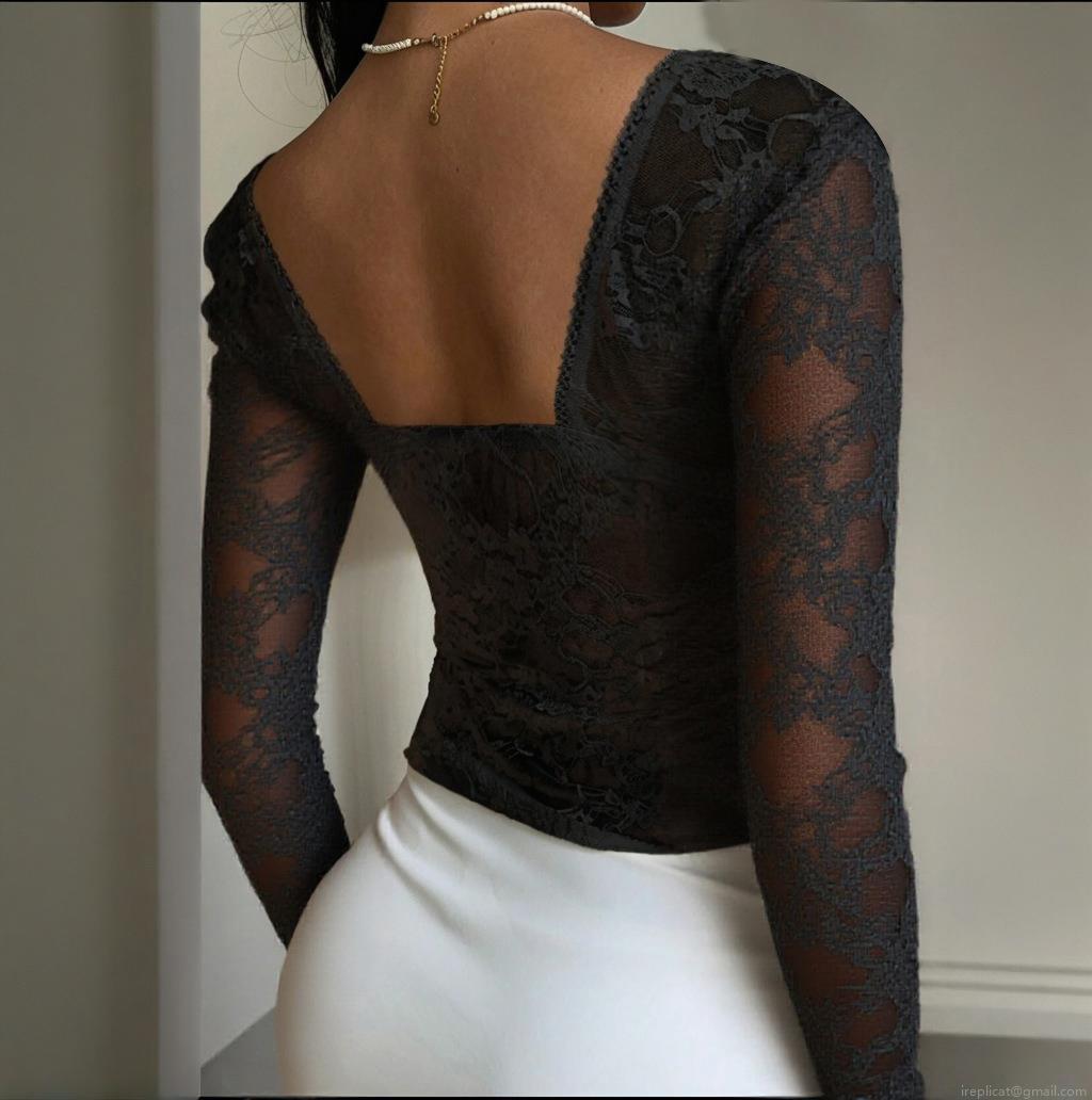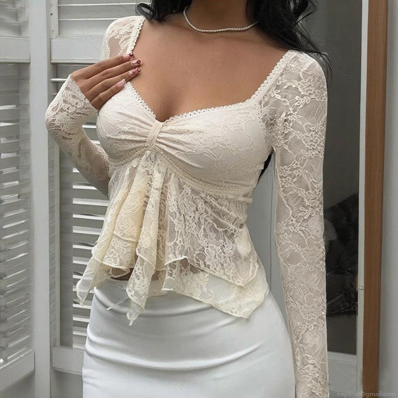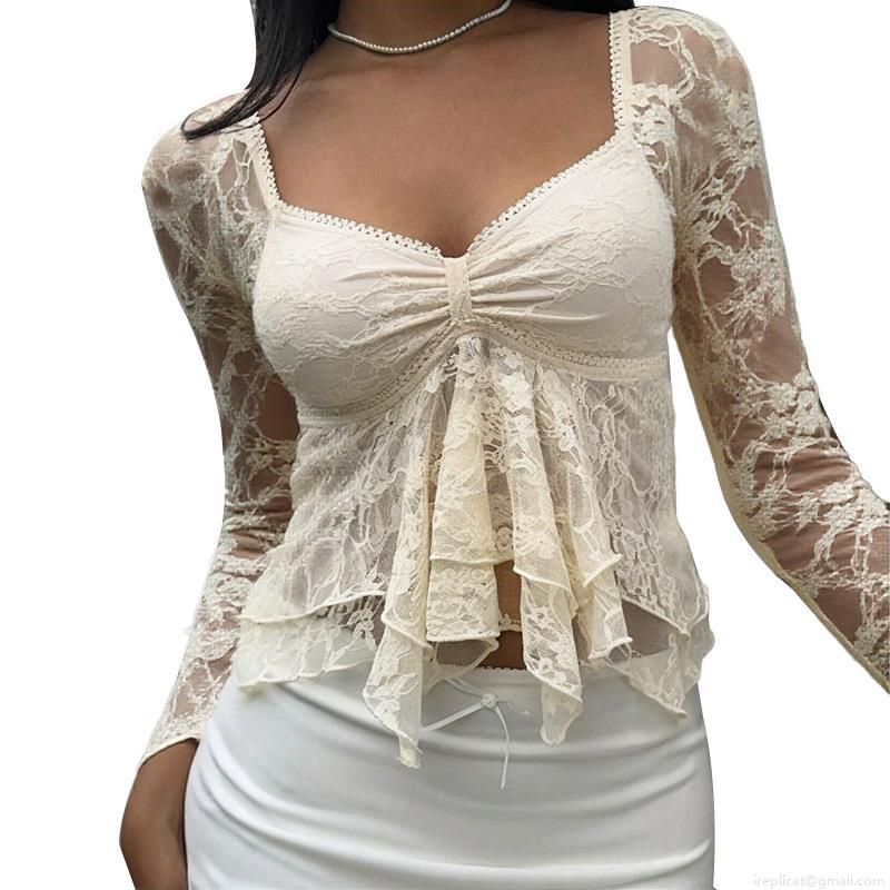 • French Retro Lace Long Sleeve Top Women Sexy Hollow Out Ruched Slim Fit Crop Blouse Elegant Ruffled V-Neck Sheer Floral Lace Shirt For Dating Party