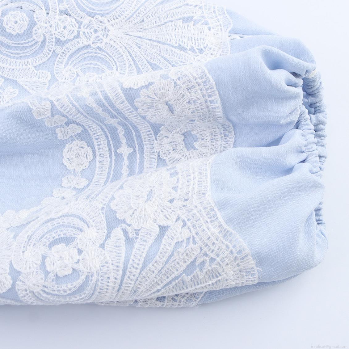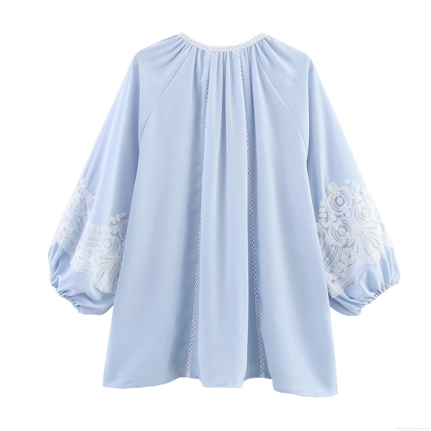 • French Romantic Lace Stitching Women Blouse Light Blue Lantern Long Sleeve Tie Neck Top Bohemian Pastoral Style Casual Blouse for Women