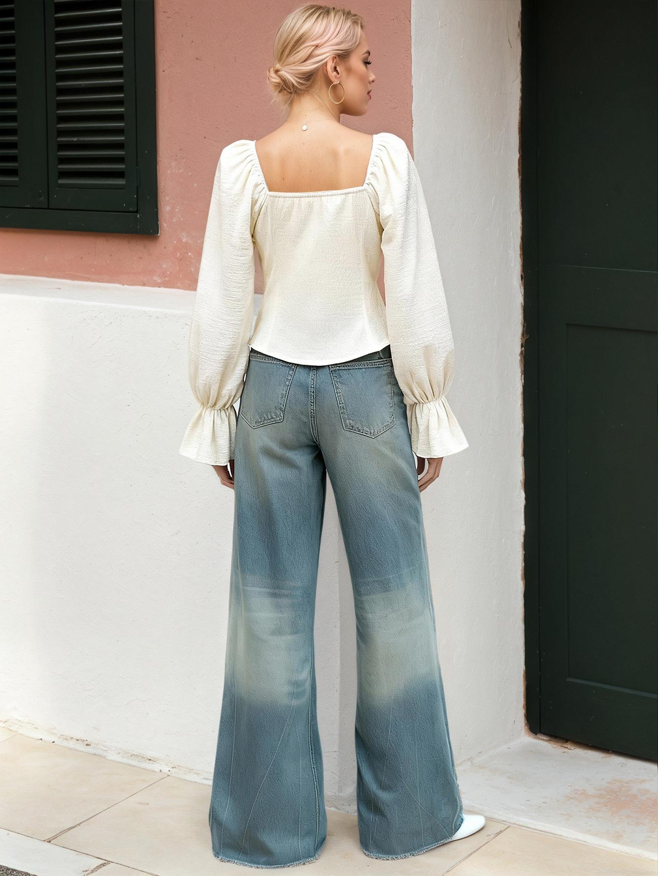Solid Color, Wood Ear Edge, Wrinkling, Puff Sleeves, Square Collar, Bell Sleeves, Pleated Texture, Waist Buttons