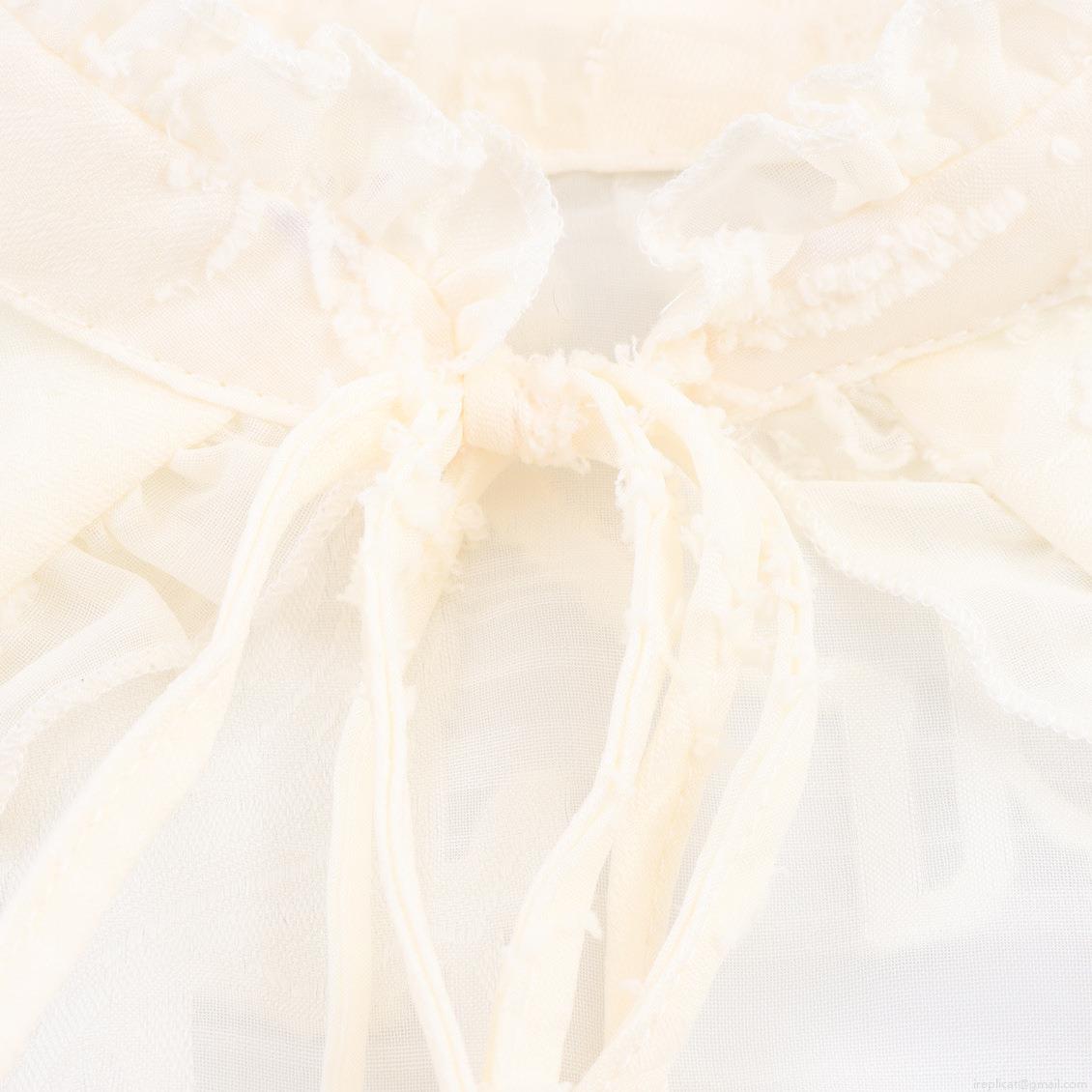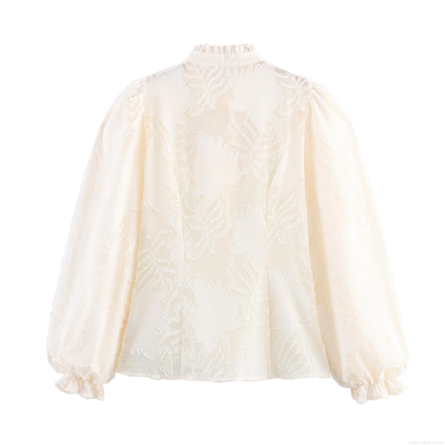 • French Style Sweet Milk White Jacquard Long Sleeve Shirt Women Hollow Lace Up Ruffle Stand Collar Blouse Pearl Buttons Spring Slim Fit Elegant Tops