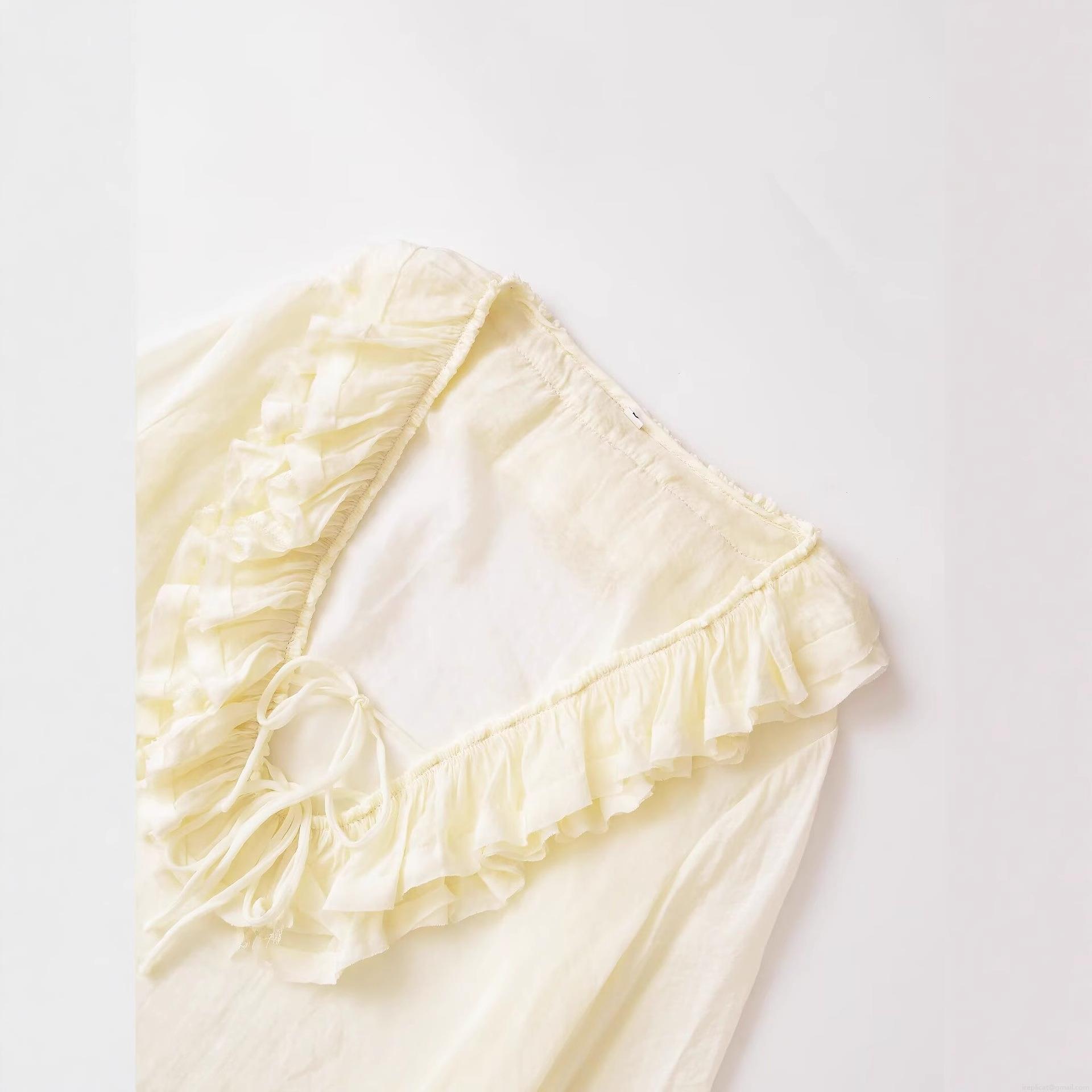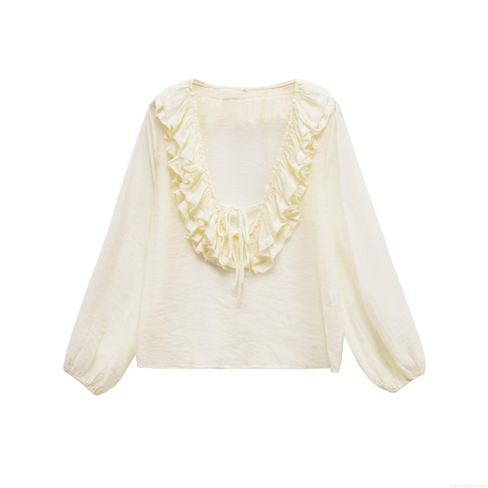 • French Style V Neck Ruffle Layered Long Sleeve Blouse Women 100% Polyester Solid Color Sweet Elegant Tops For Casual Party Daily Wear