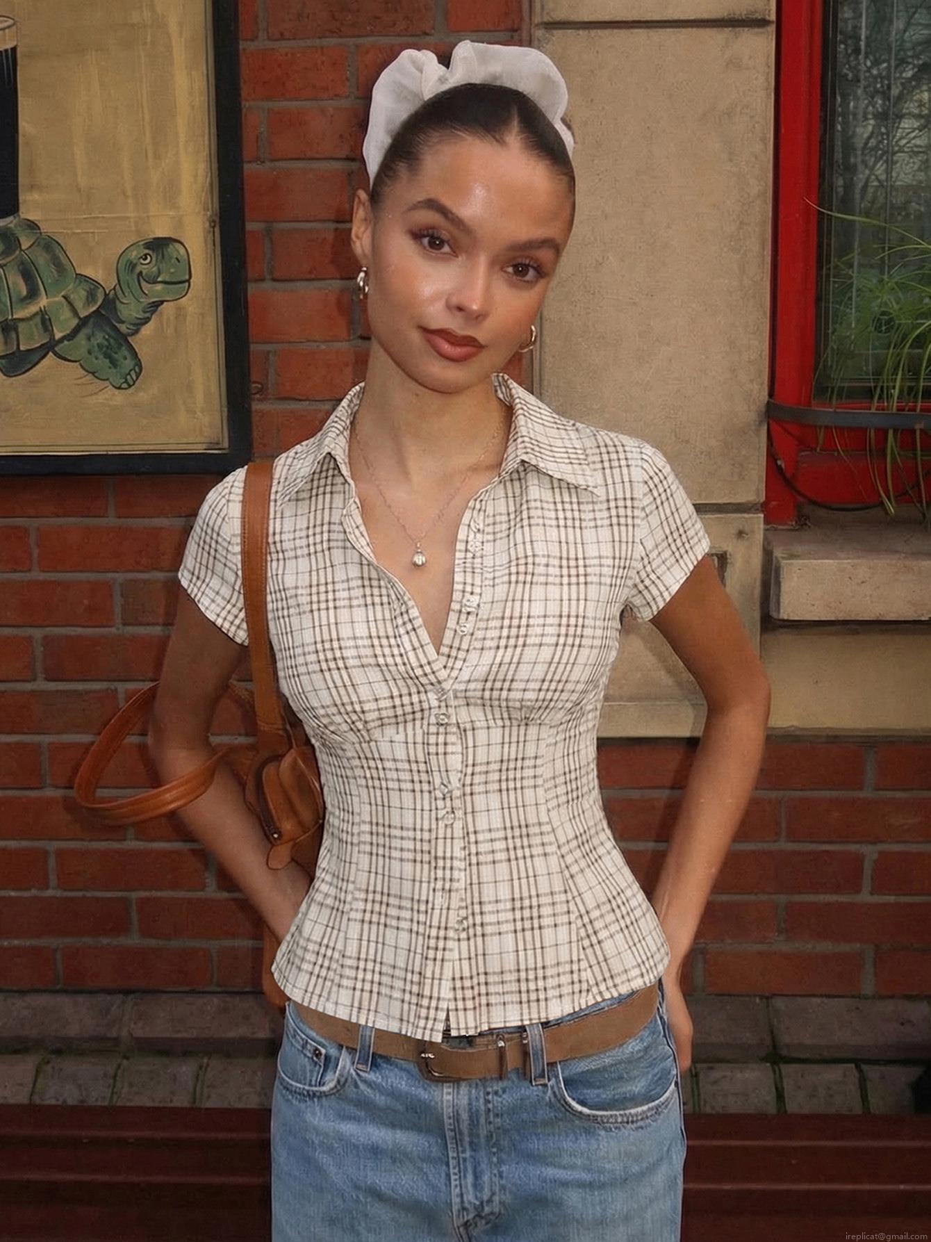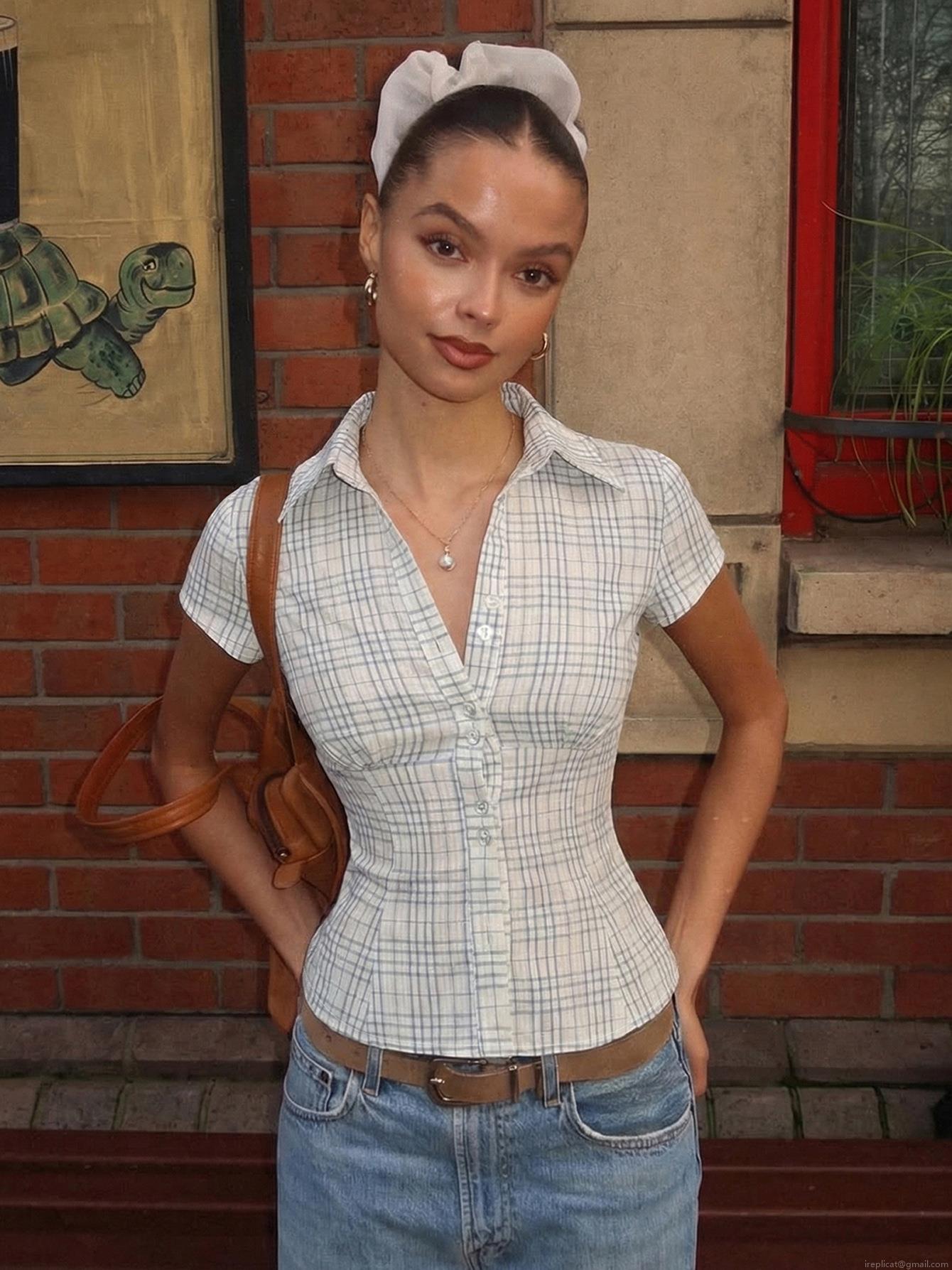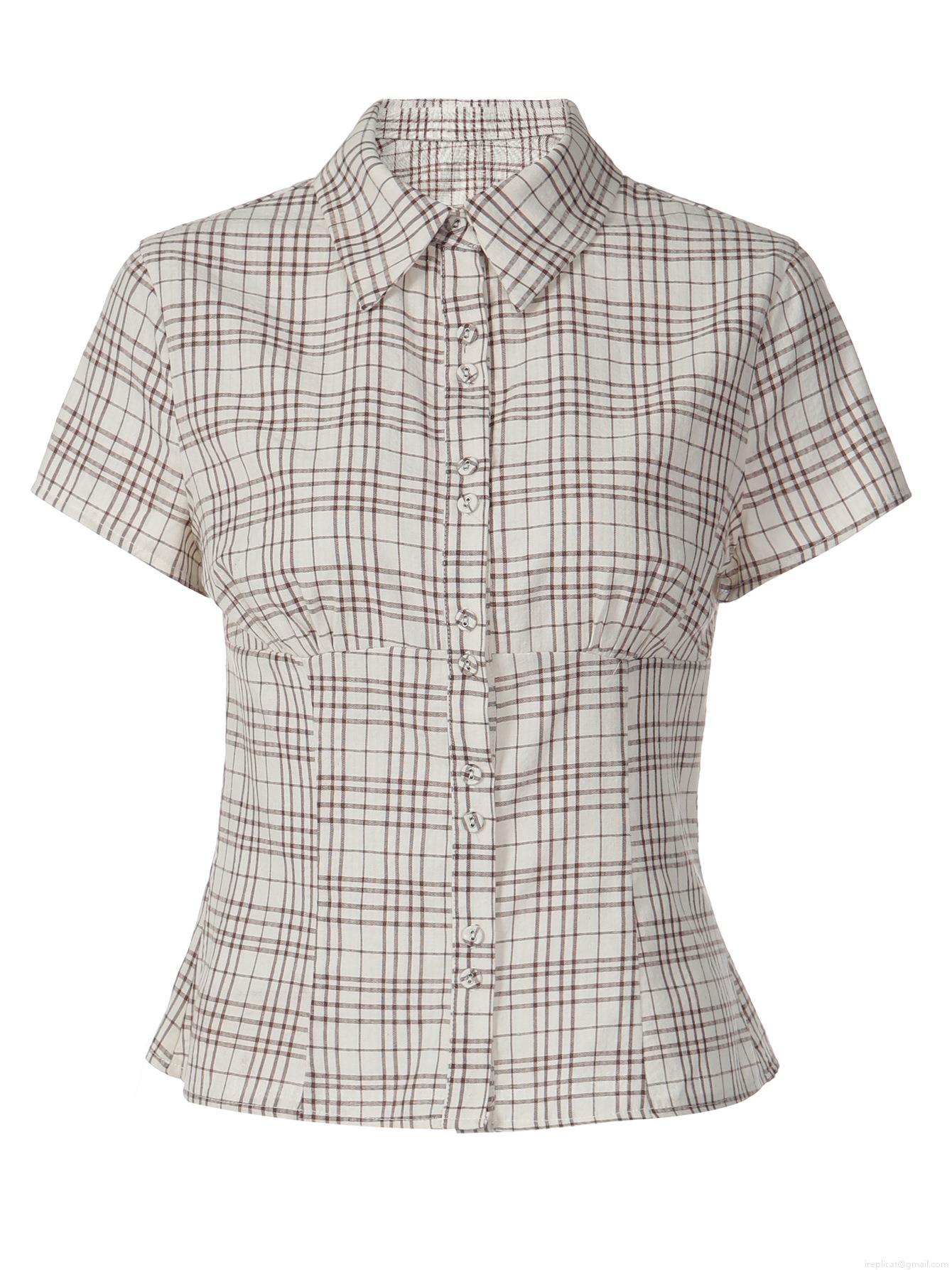 • French Style Women's Short Sleeve Plaid Shirt Rayon Polyester Blend Slim Fit Button Down Blouse Retro Streetwear Top For Summer Casual Fashion