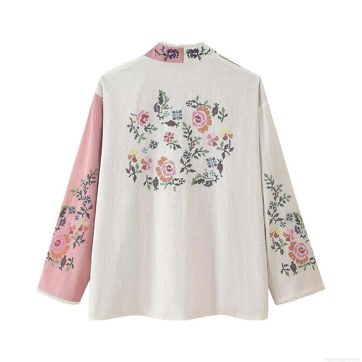 • French Sweet Pastoral Style Women's Embroidery Blouse Polyester Long Sleeve Lace Trim Loose Color Block Top Casual Shirt For Women