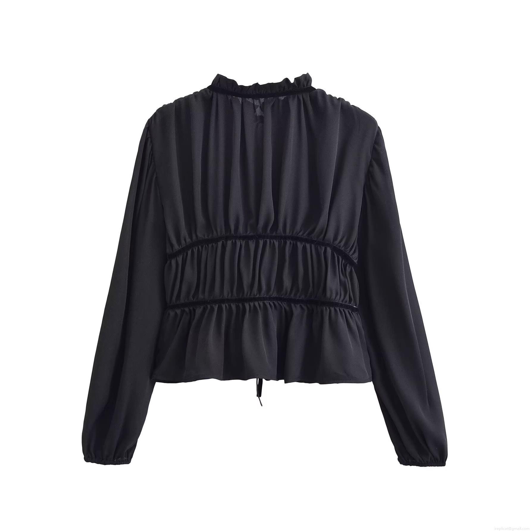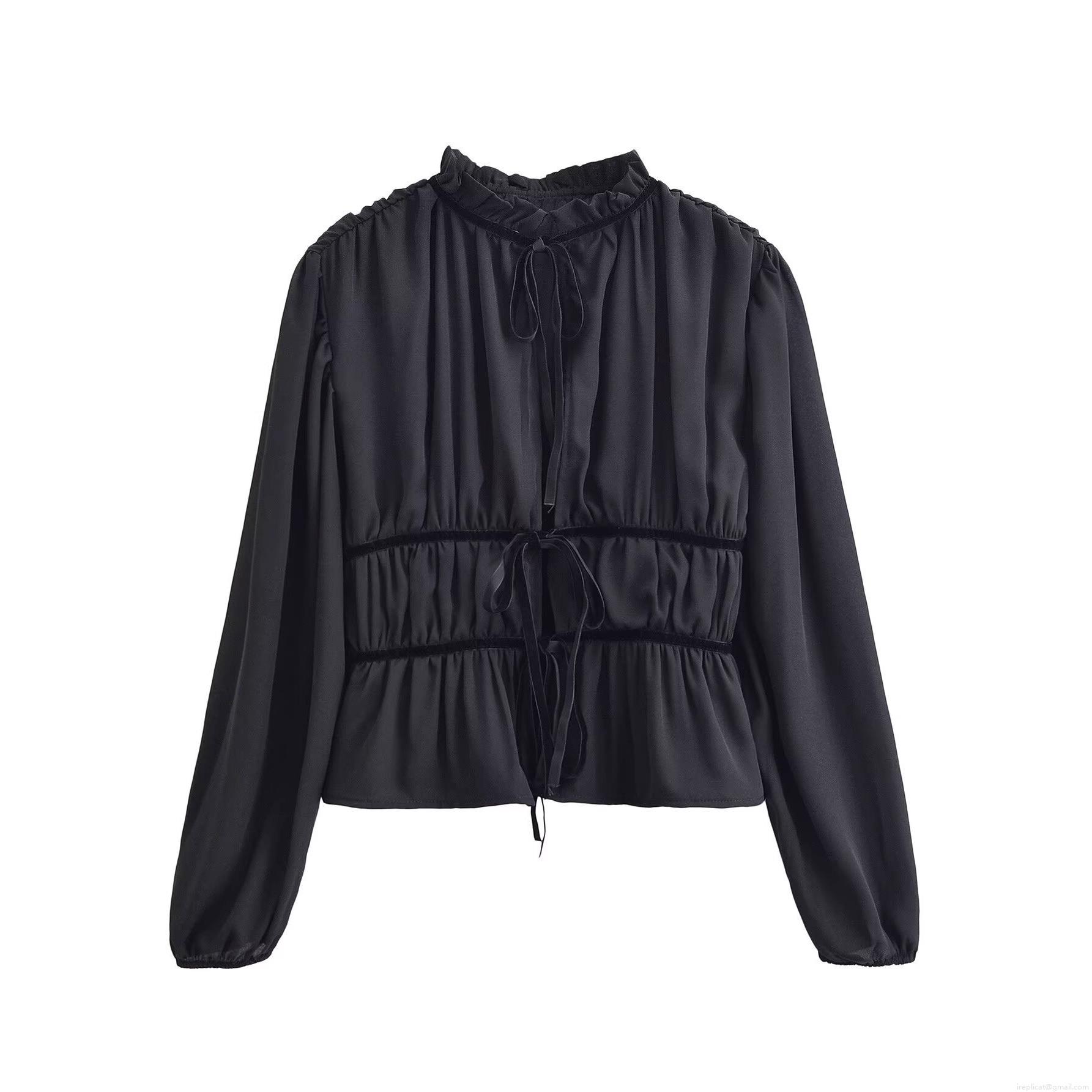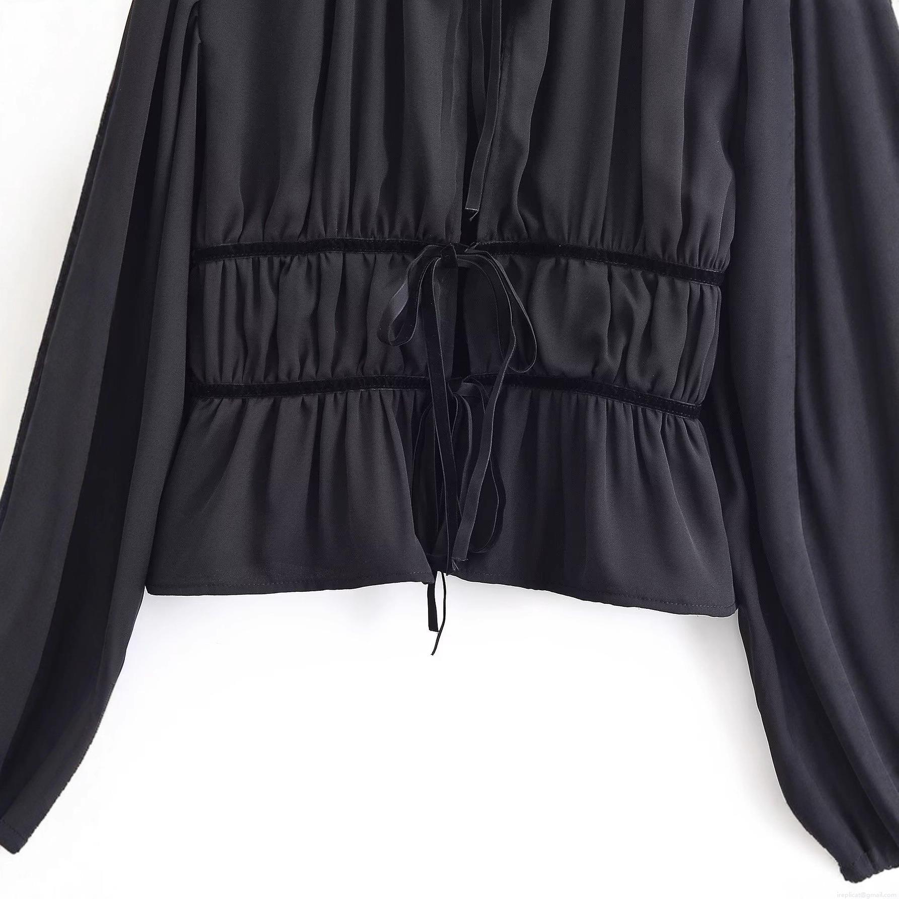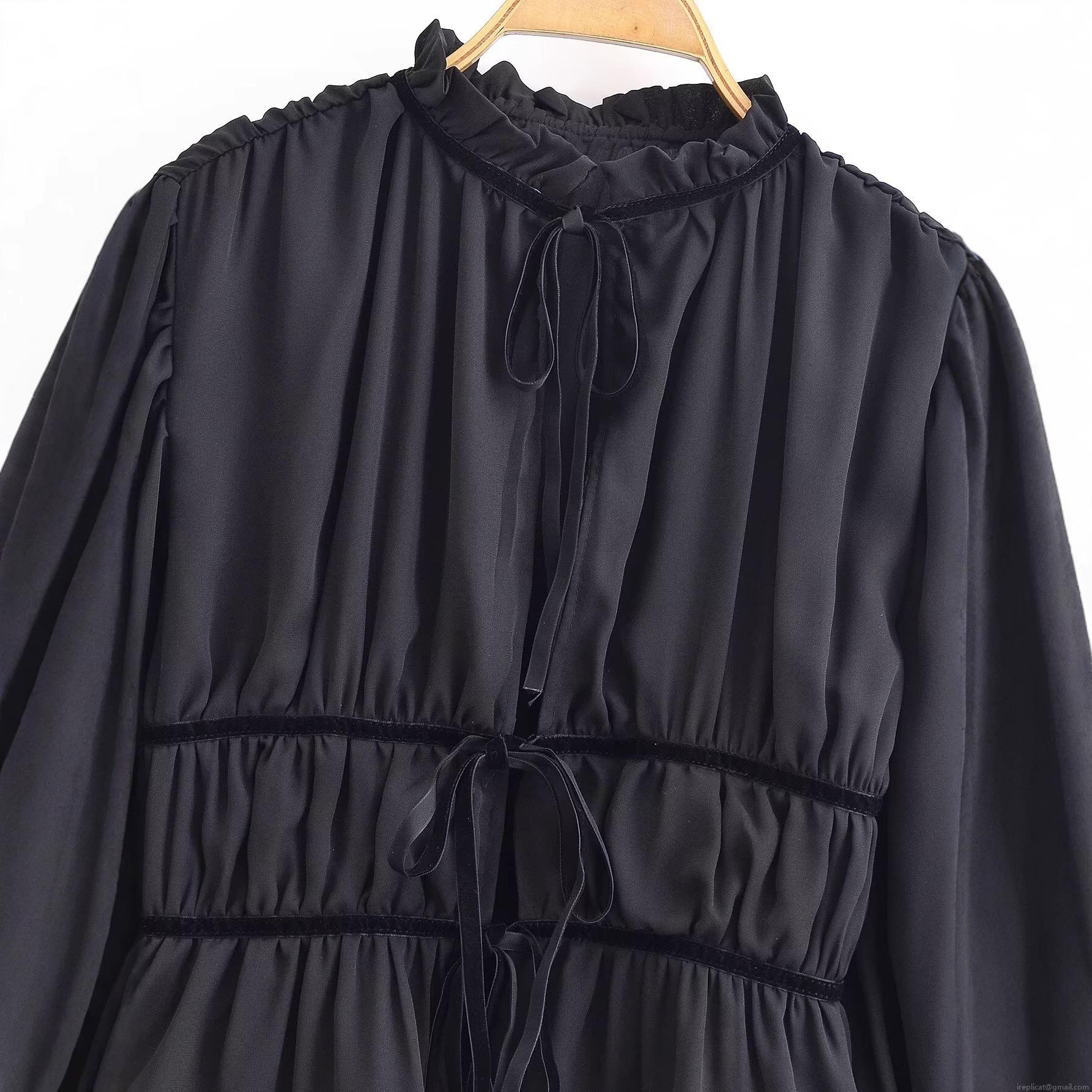 French Vintage Black Ruffle Stand Collar Tie-up Bow Blouse Women Long Lantern Sleeve Elastic Waist Peplum Top Elegant Socialite Chiffon Style Shirt