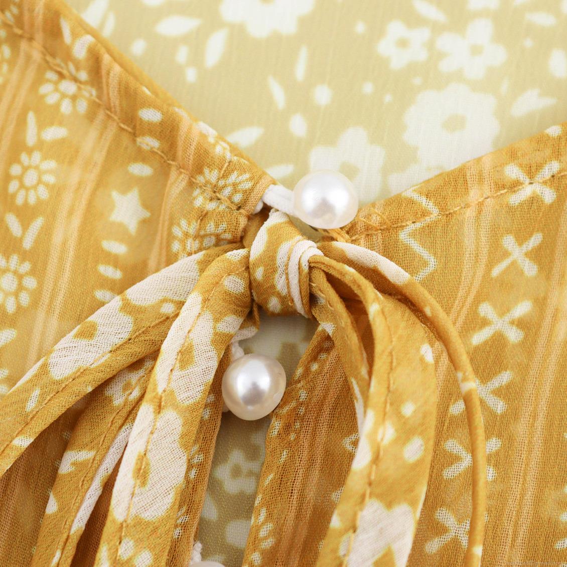 French Vintage Floral Print Chiffon Blouse Women Elegant Tie Neck Pearl Button Ruffled Shoulder Long Sleeve Loose Fit Casual Spring Top Shirt