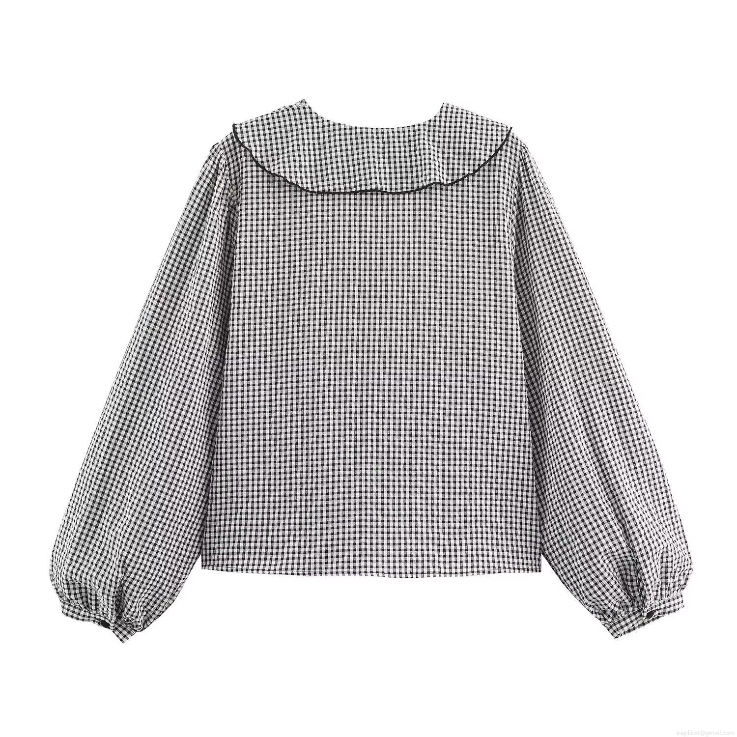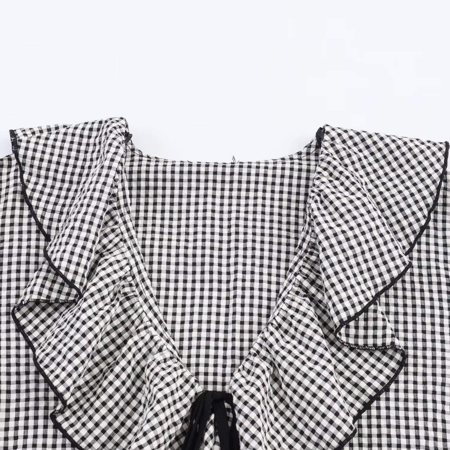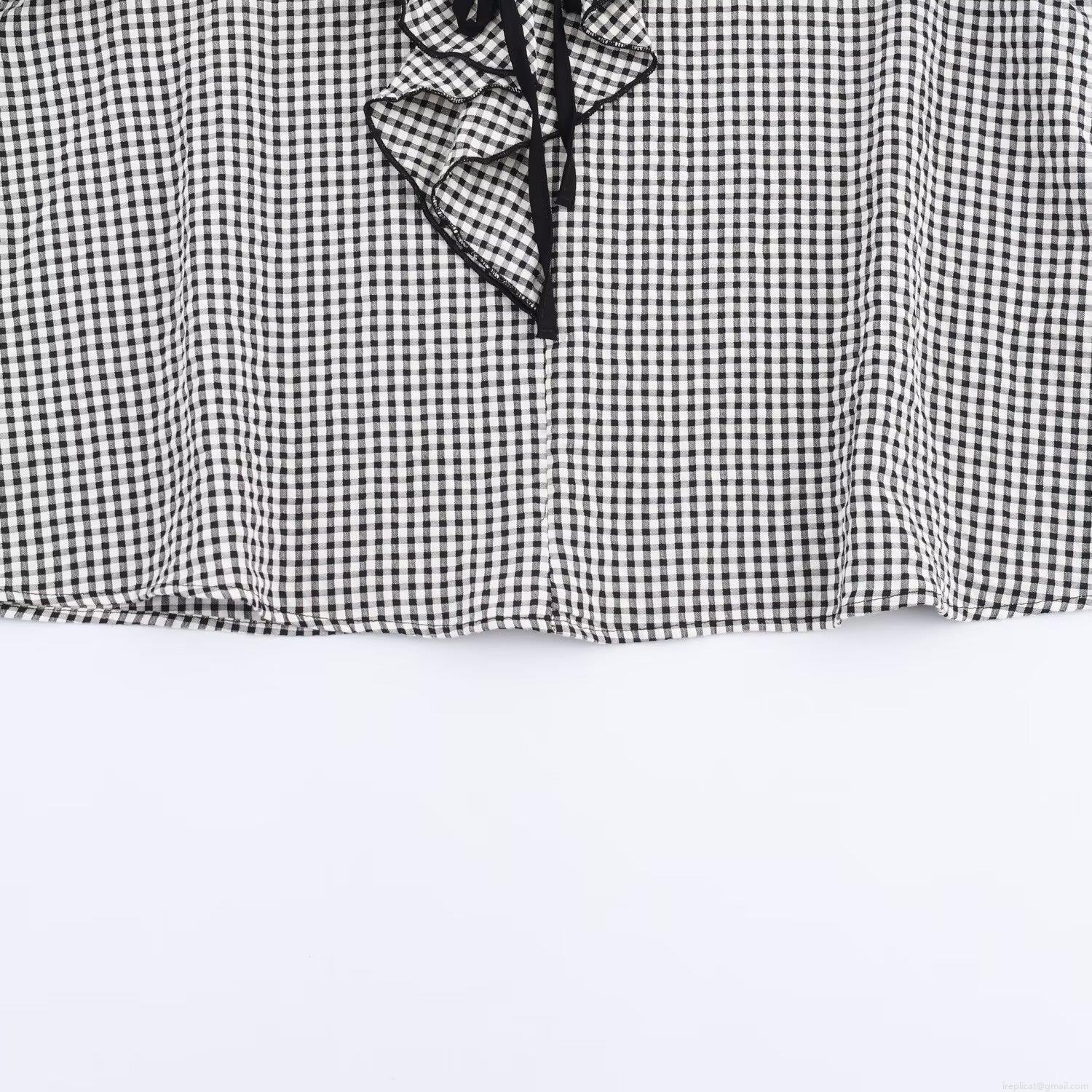 • French Vintage Sweet Women's Gingham Ruffle Blouse Long Sleeve Layered V-Neck Tie Bow Top Polyester Spandex Casual Office Plaid Shirt
