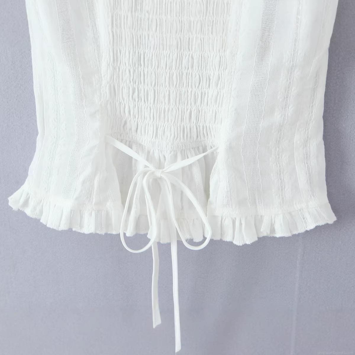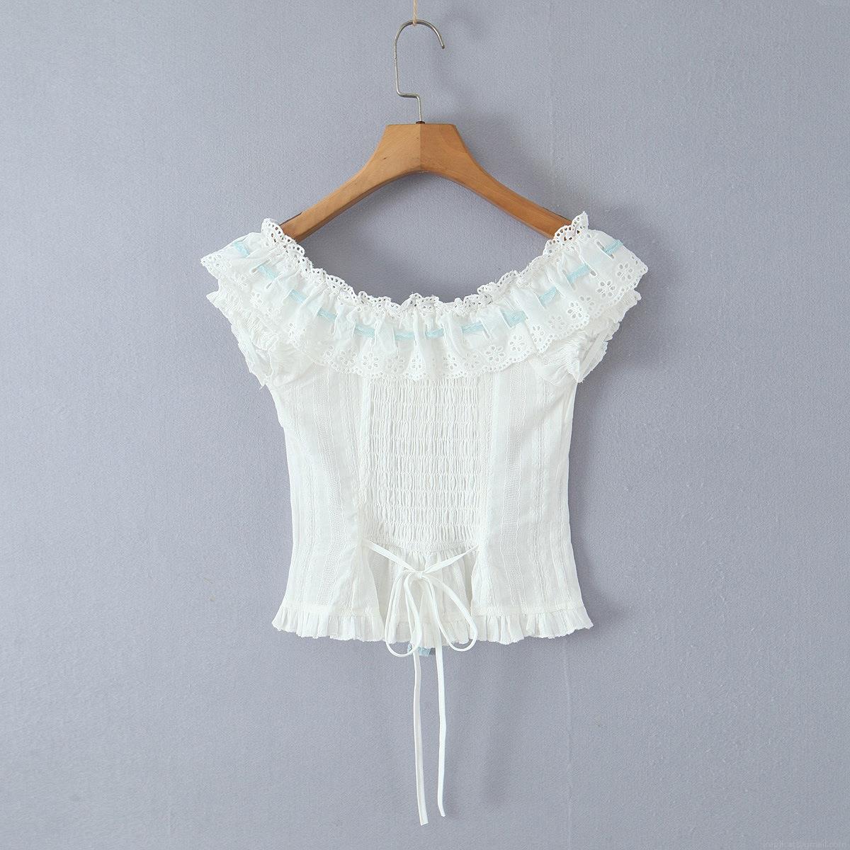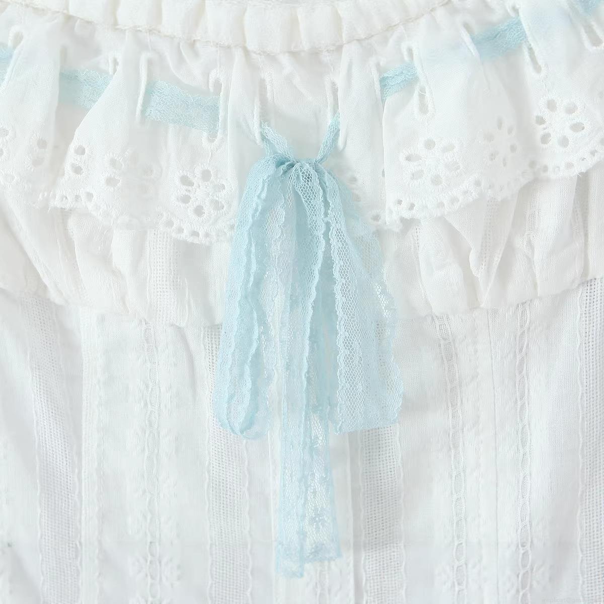 • French Vintage White Off-Shoulder Lace Top Women Sweet Eyelet Embroidery Blouse With Light Blue Ribbon Bow Ruffle Hem Summer Short Shirt