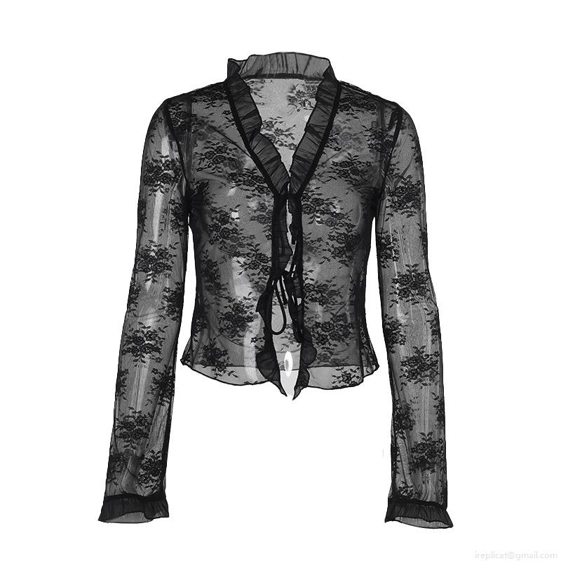 Sexy Black Floral Lace Sheer Blouse Women Long Sleeve Tie Front Cardigan Top Clubwear Slim Fit See Through V Neck Shirt