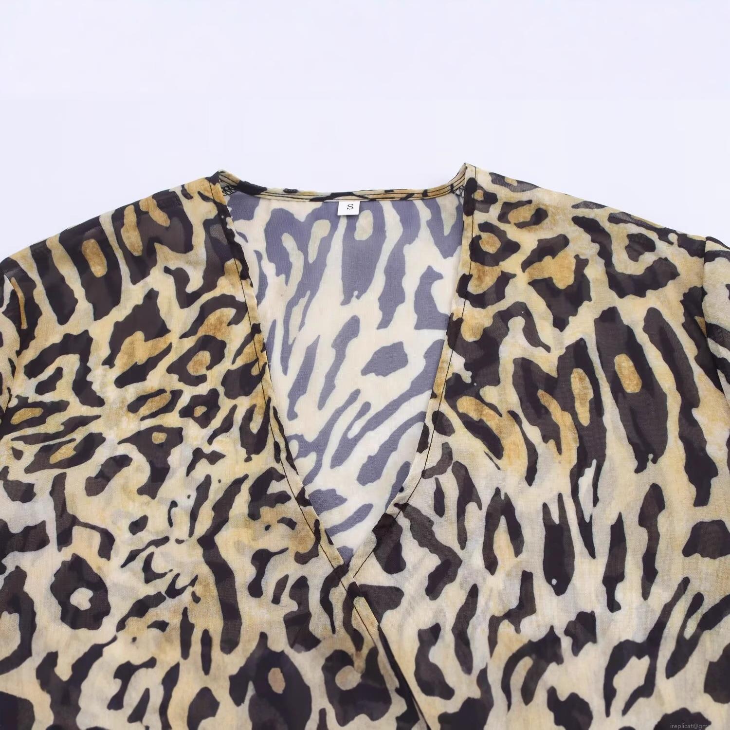 Leopard Print, Animal Print, Lace, Irregular Hem, Lantern Sleeves, Deep V-neck