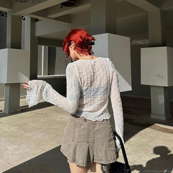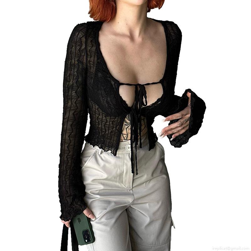 • Sexy Y2K Women Long Sleeve Lace Cardigan Tie Front See-through Mesh Top Slim Fit Lettuce Edge Cropped Sunscreen Blouse For Summer Party Streetwear