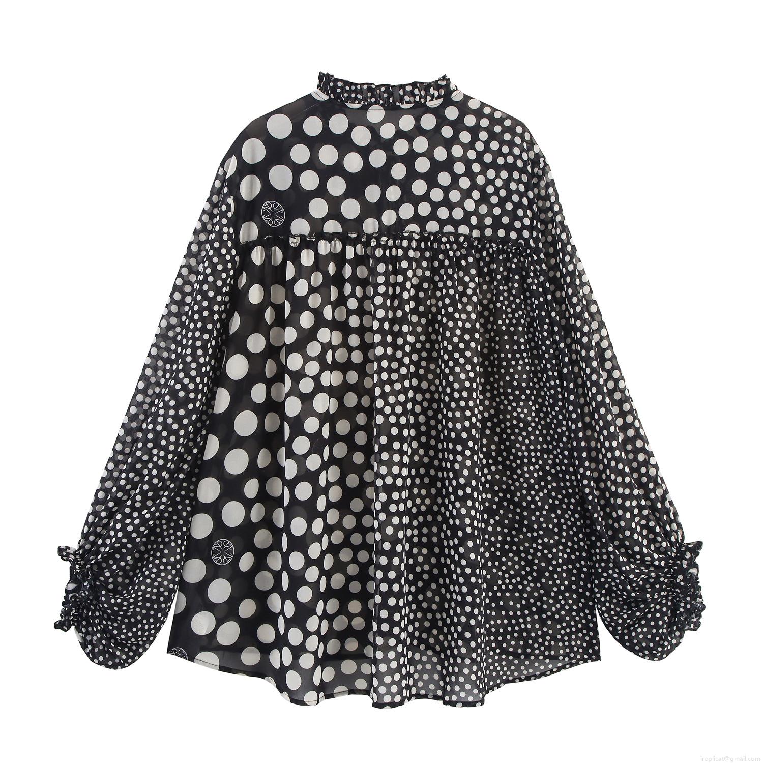 Vintage Polka Dot Chiffon Blouse Women Ruffle Stand Collar Tie Neck Lantern Sleeve Loose Casual Shirt Retro Elegant Ladies Tops