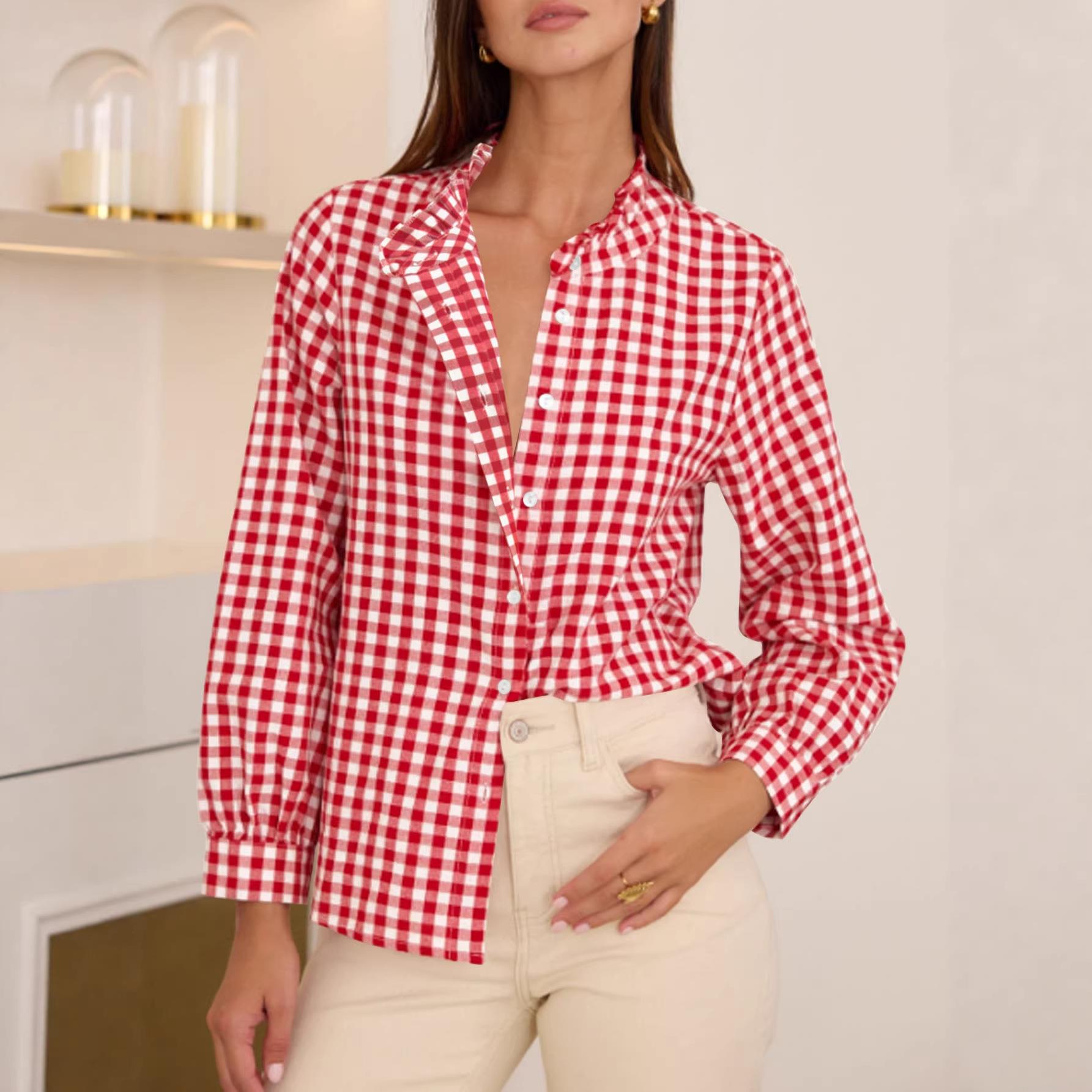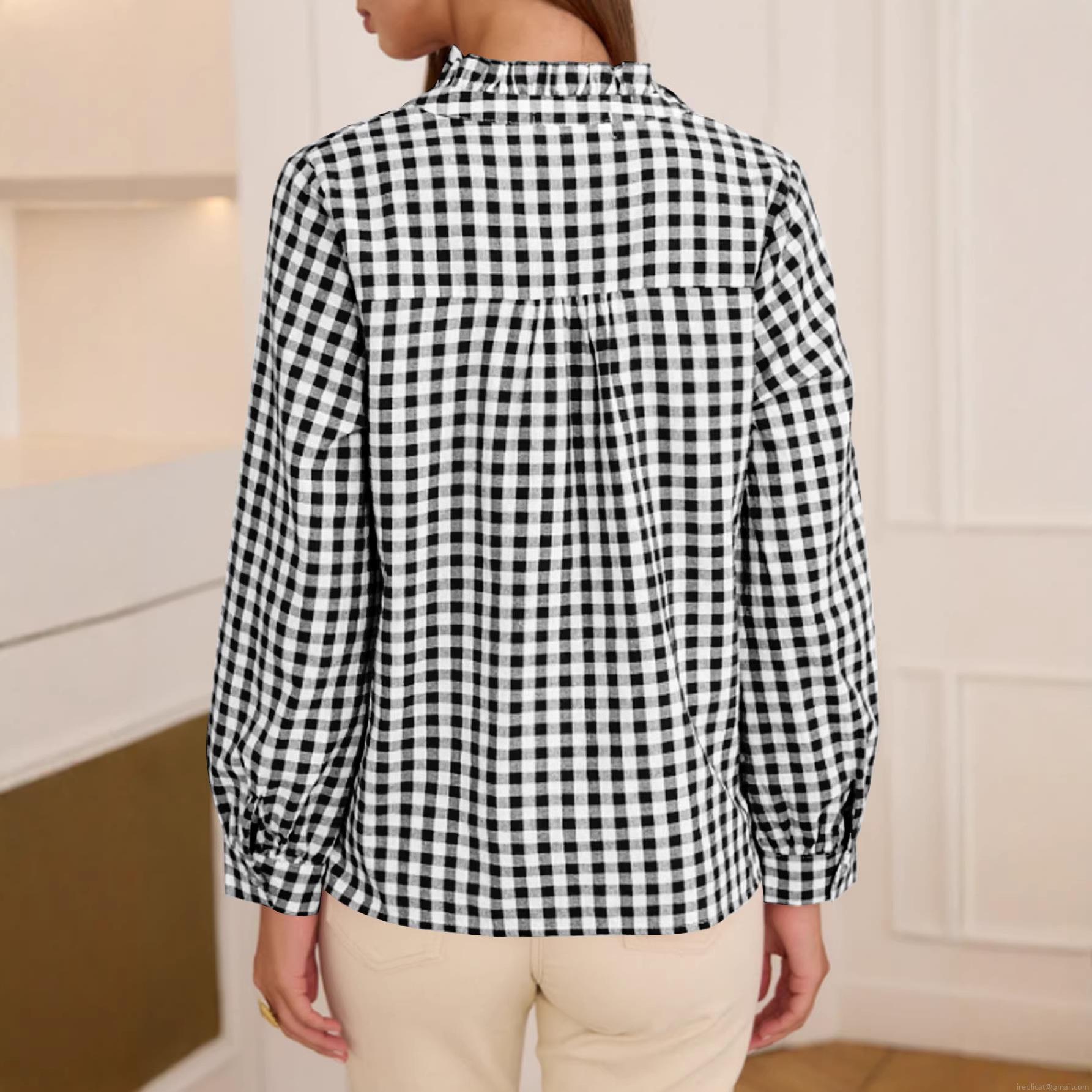 • Vintage Sweet Gingham Plaid Shirt Women Wood Ear Ruffle Collar Long Sleeve Blouse Single Breasted Casual Tops Polyester Spandex Spring Autumn Clothing