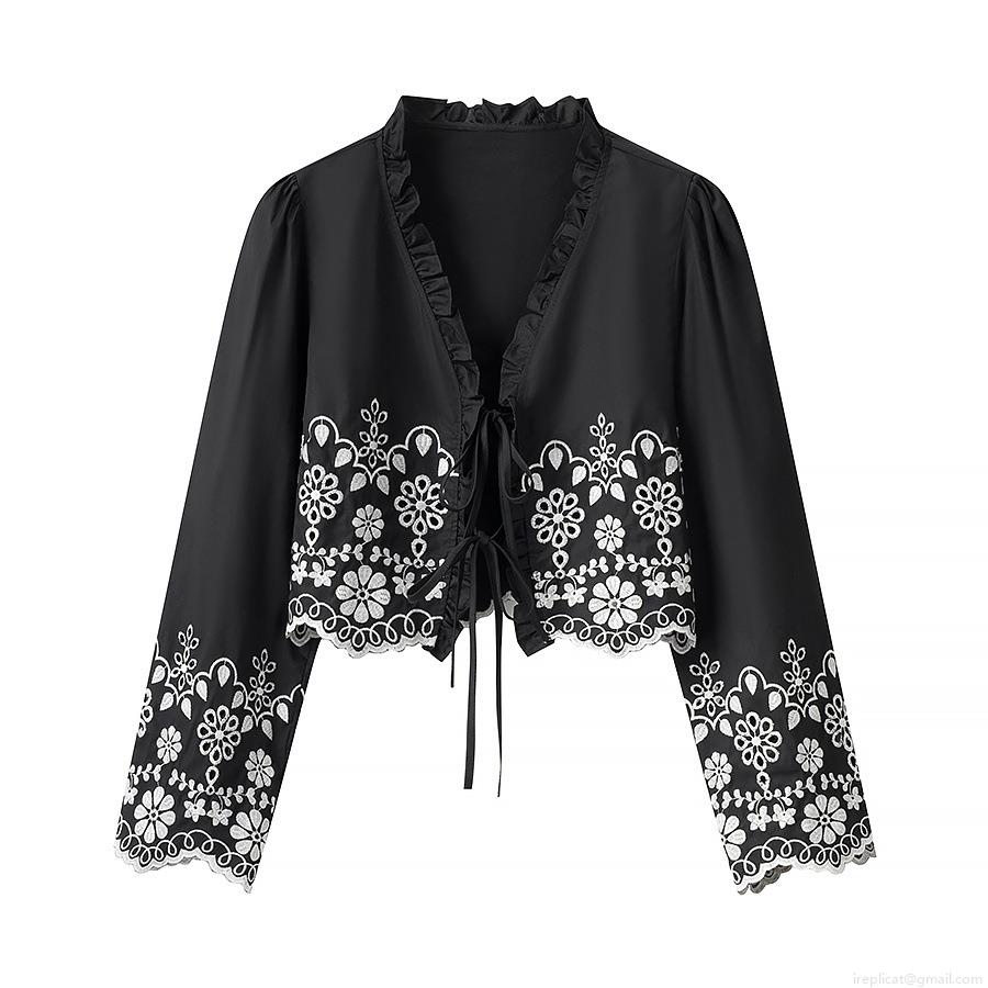Vintage Women's Long Sleeve Black Blouse Polyester White Floral Embroidery Ruffle Collar Tie-up Scalloped Edge Loose Cropped Fashion Top