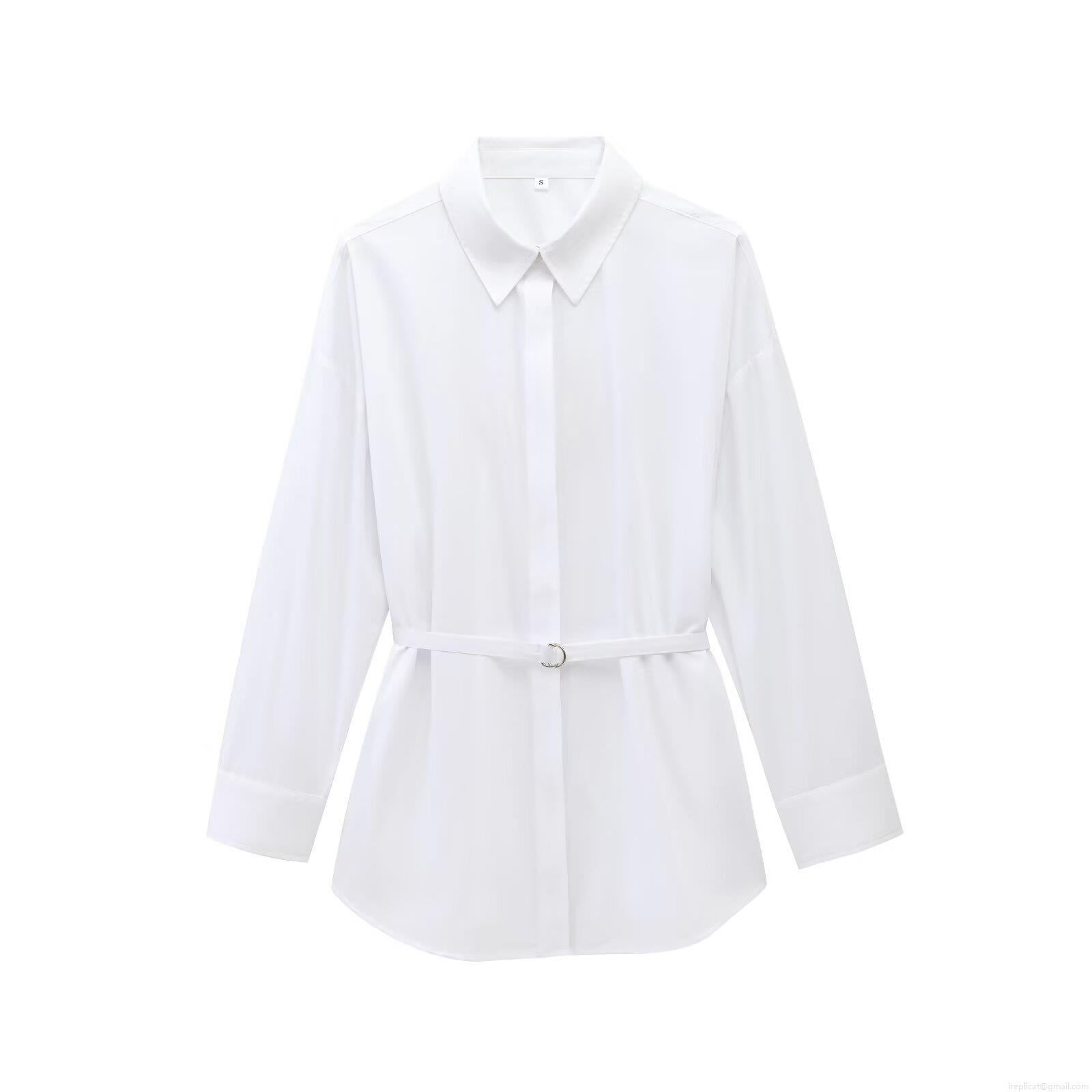 • White Long Sleeve Blouse Shirt With Belt Women's Casual Lapel Button Down Street Style Poplin Top For Office Daily Wear Fashion Lady