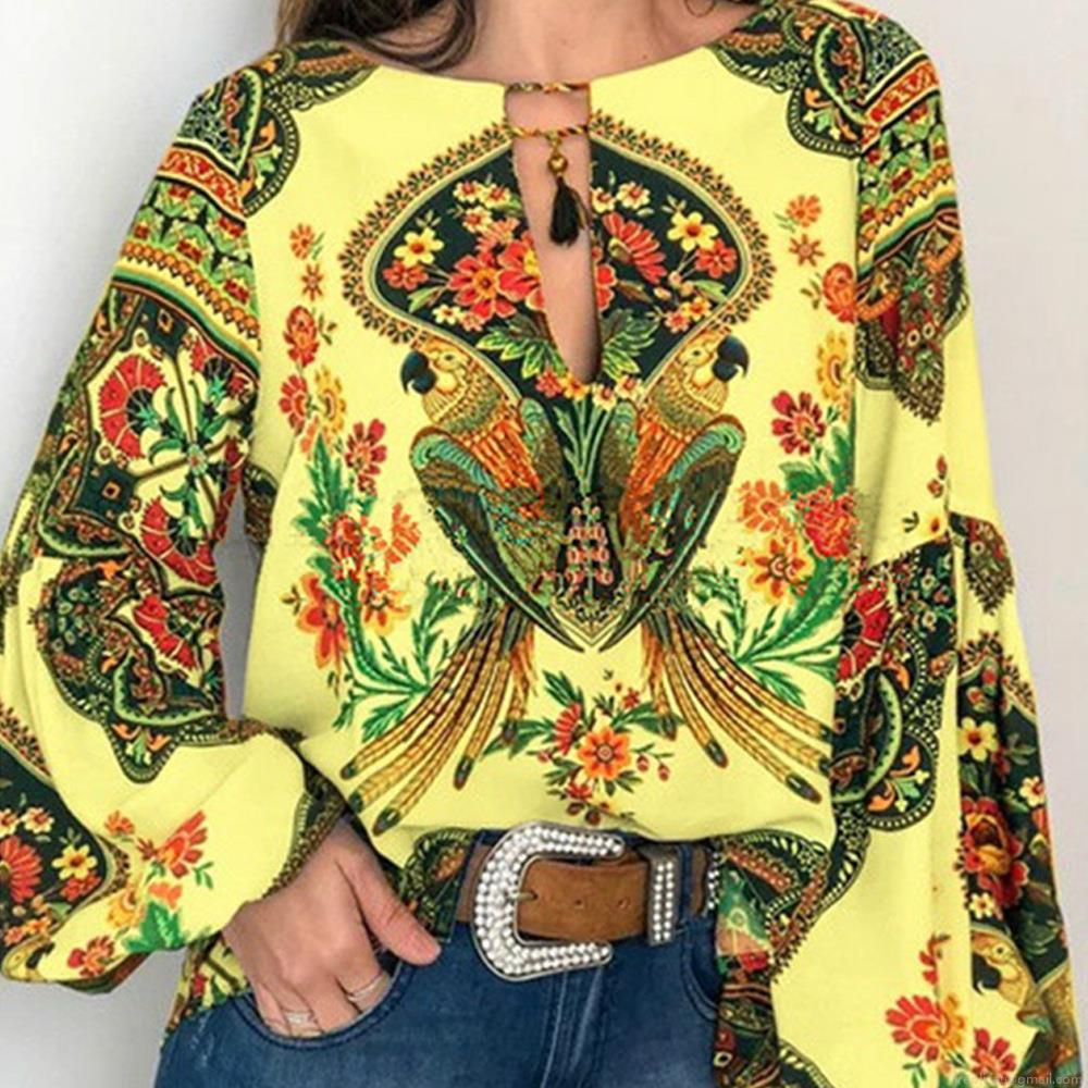 • Women Bohemian Digital Parrot Floral Print Blouse Long Sleeve Chiffon Shirt Casual Loose V Neck Tassel Tie Tops Spring Summer Clothing