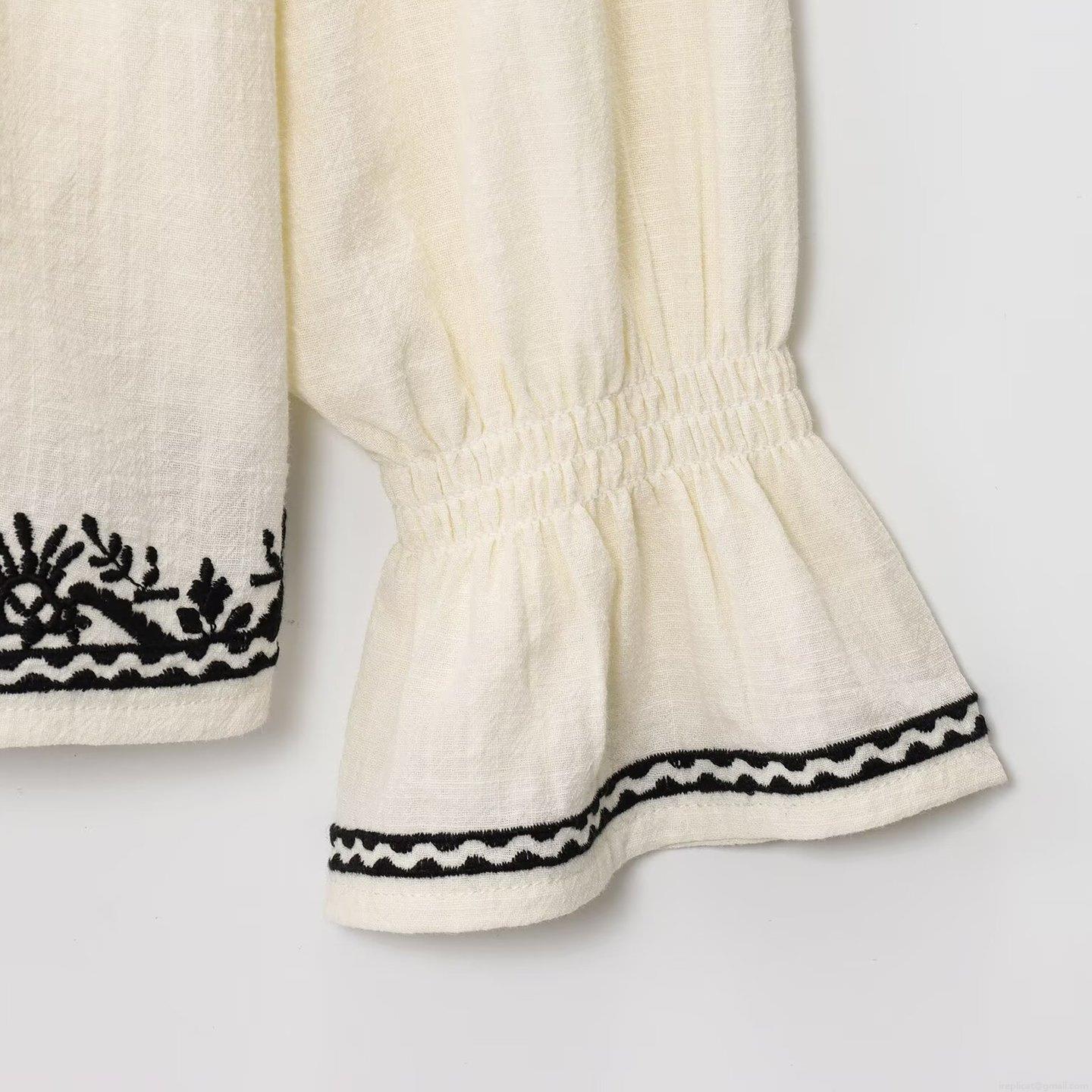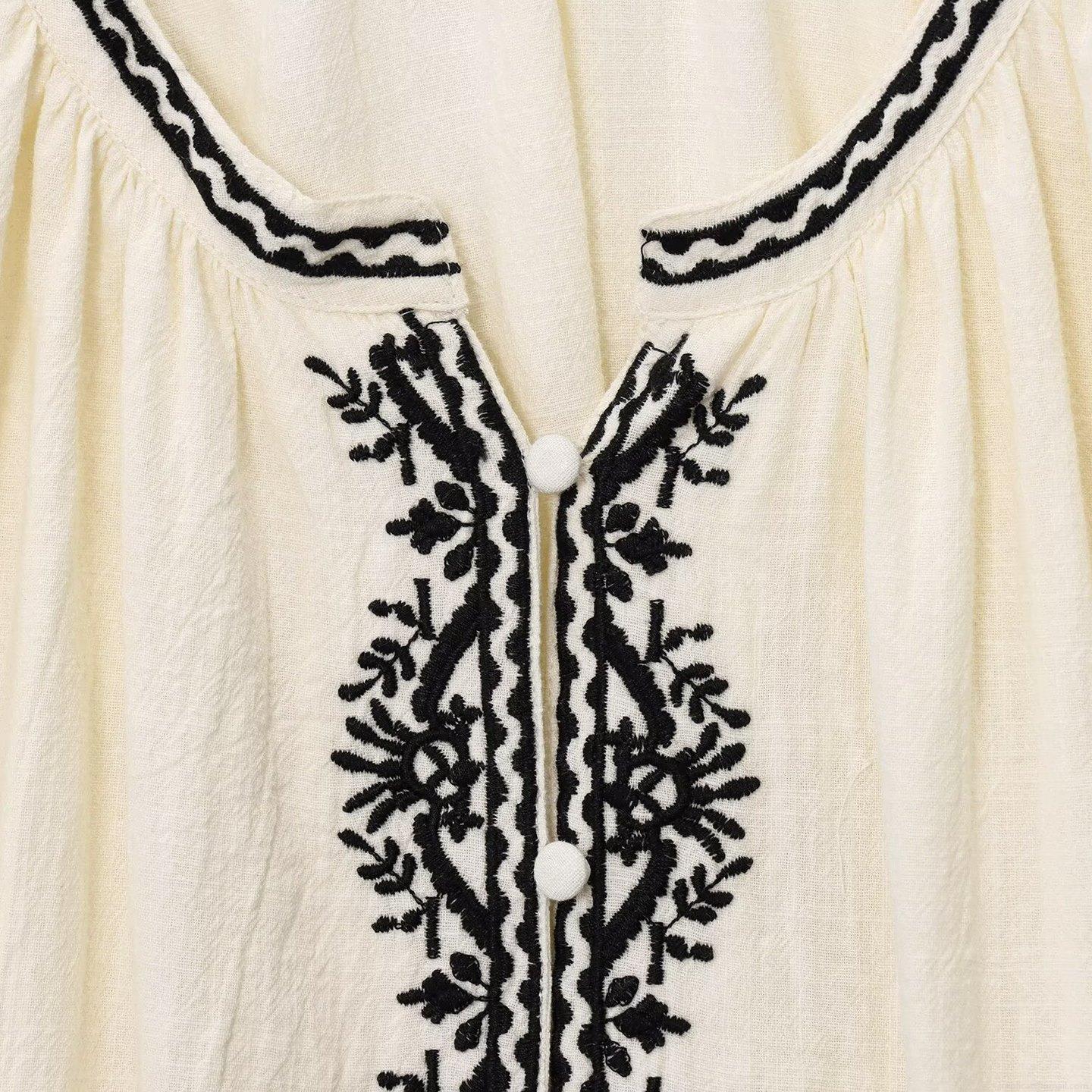 • Women Bohemian Flare Sleeve Embroidered Blouse Loose Round Neck Button Down Polyester Top for Summer Vacation Street Style Cream White Shirt