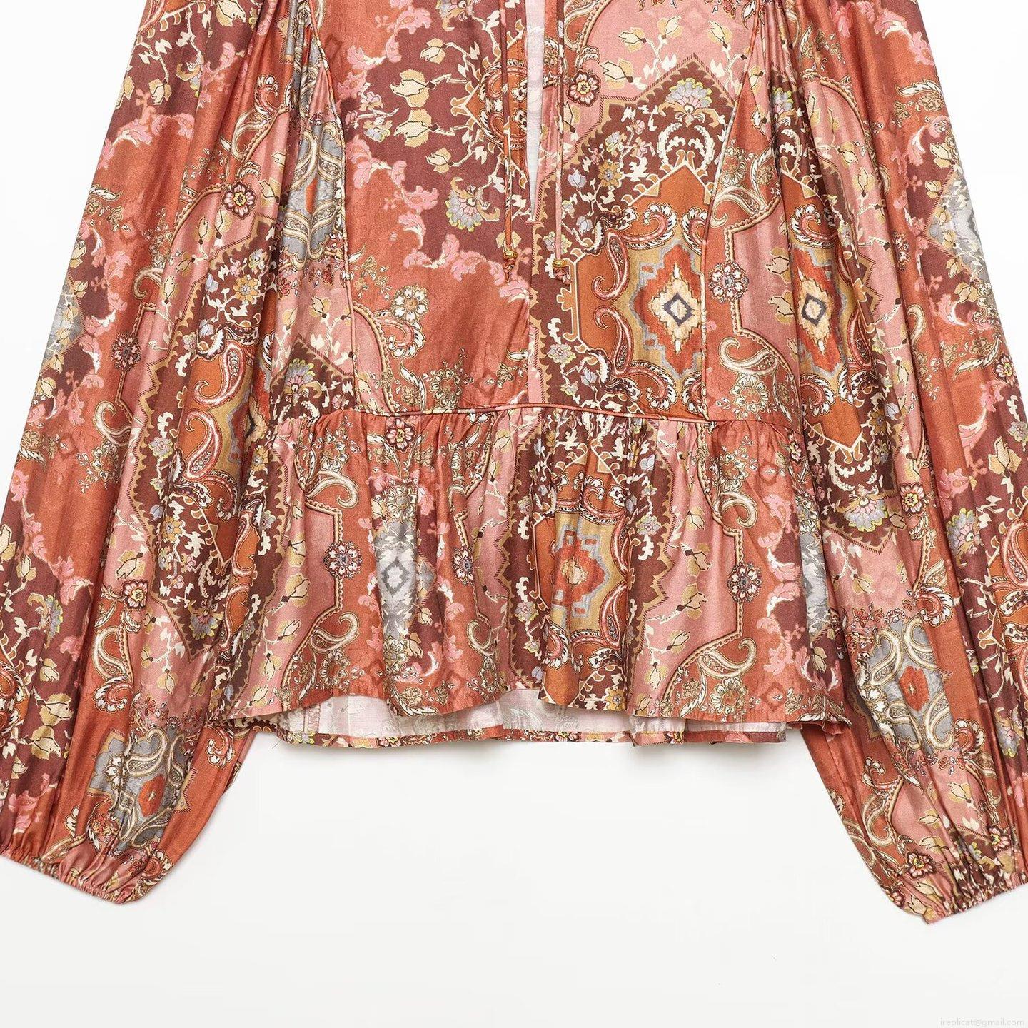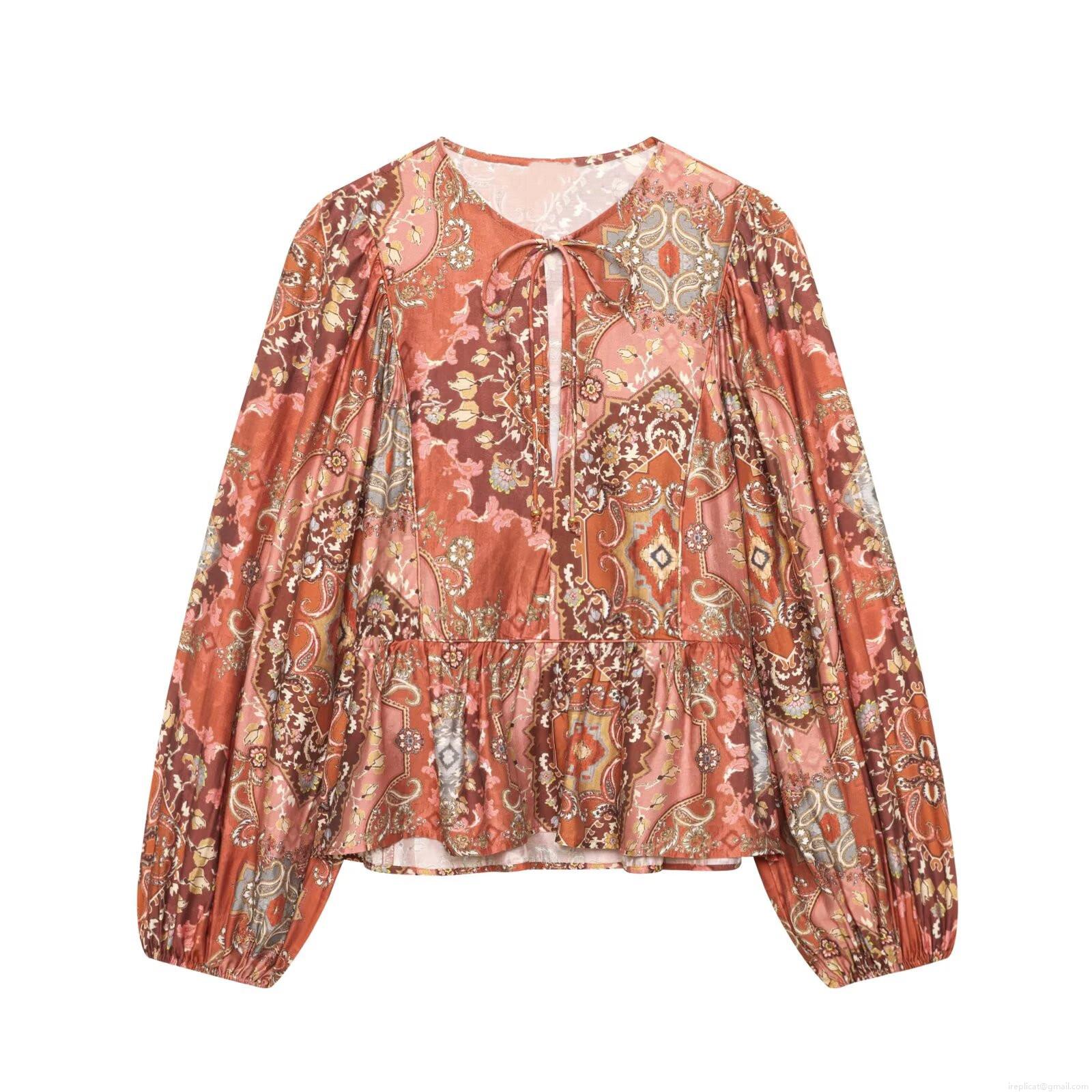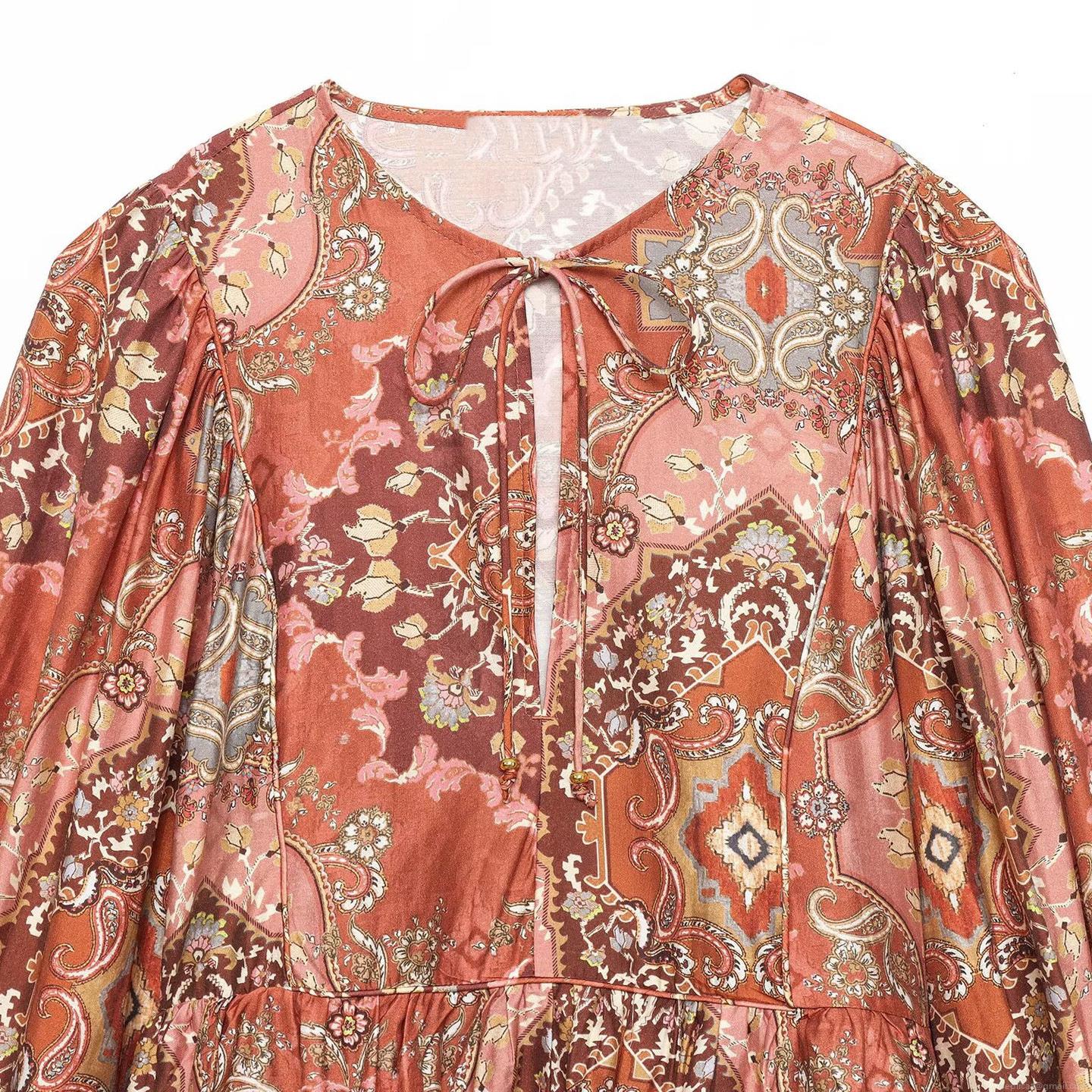 • Women Bohemian Paisley Print Long Sleeve Blouse Top With Tie Neck Ruffle Hem Loose Fit Polyester Casual Tunic Shirt For Travel Daily Vacation
