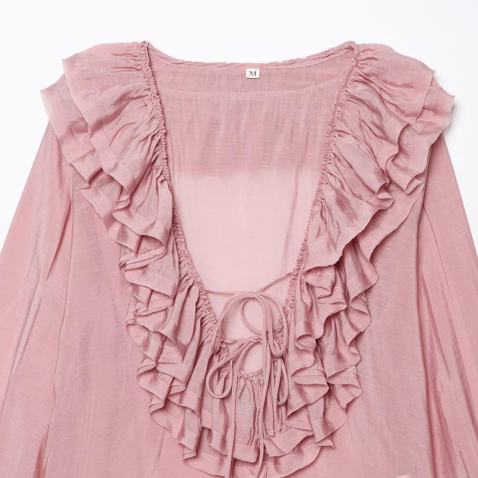 • Women Casual Long Sleeve Chiffon Blouse V Neck Ruffle Tiered Solid Color Loose Fit Tie Neck Fashion Summer Shirt For Ladies