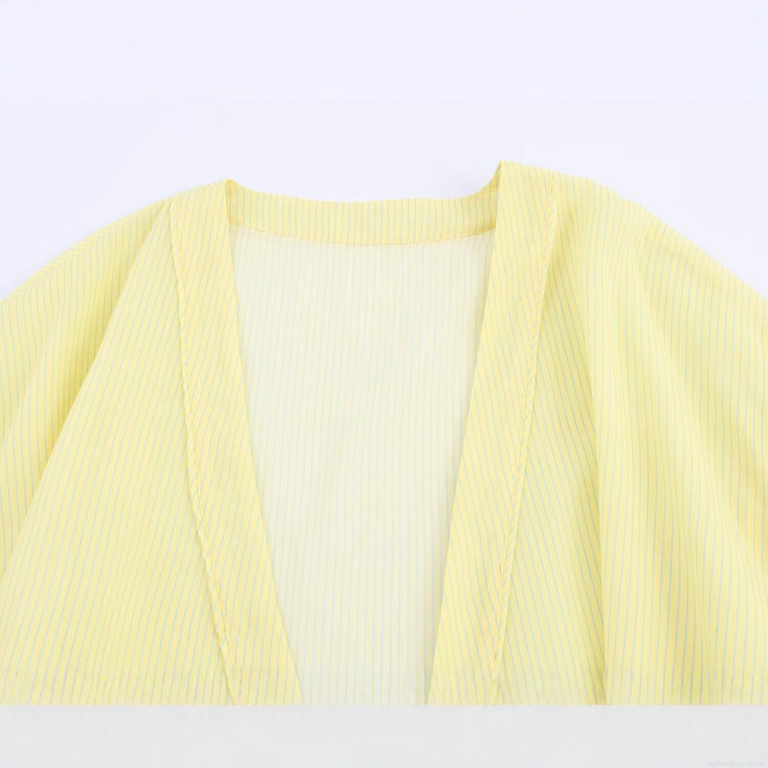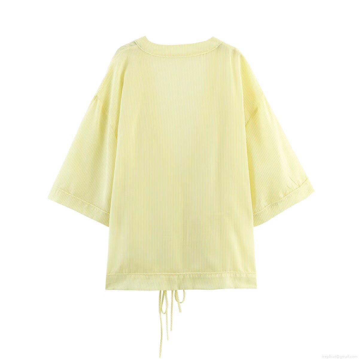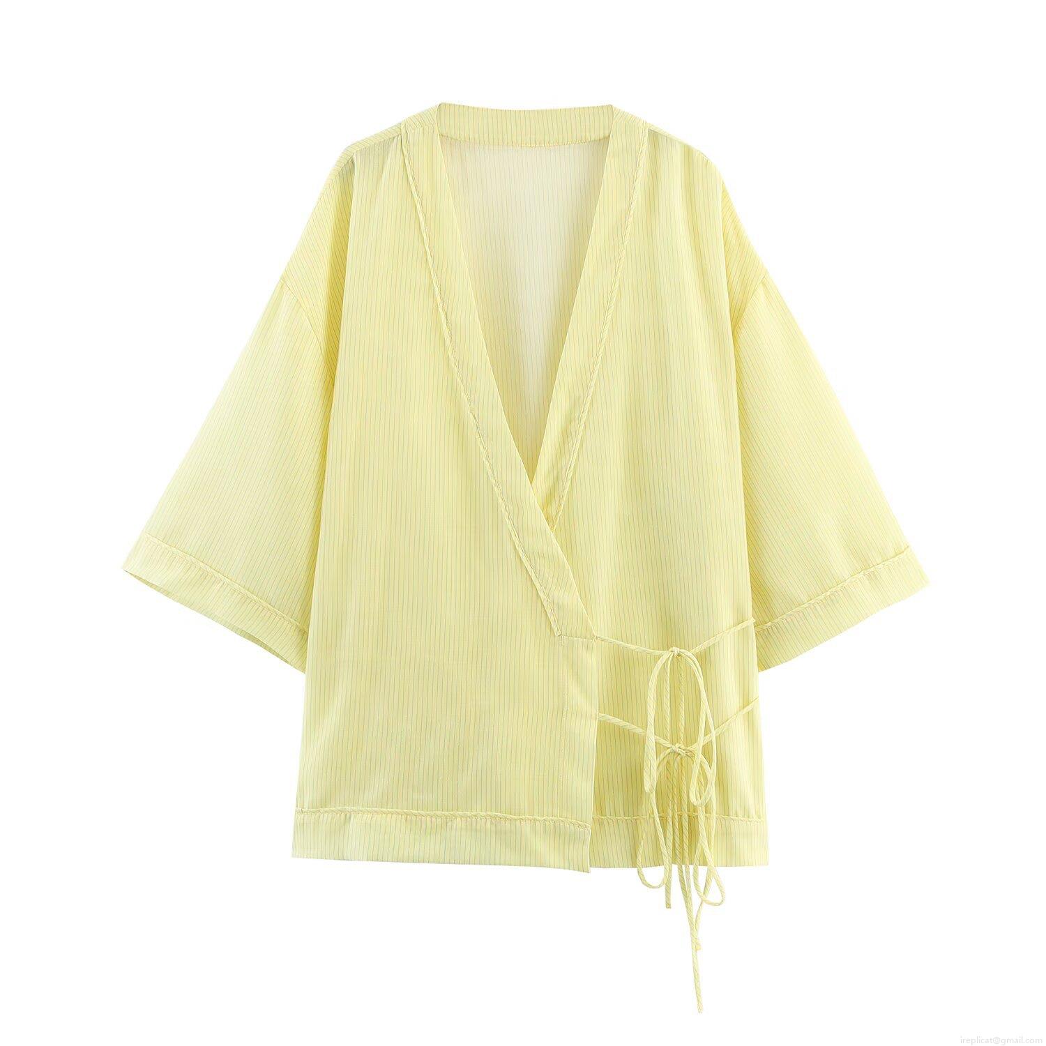 • Women Casual Striped V Neck Bow Knot Blouse Polyester Short Sleeve Kimono Wrap Shirt Streetwear Tops