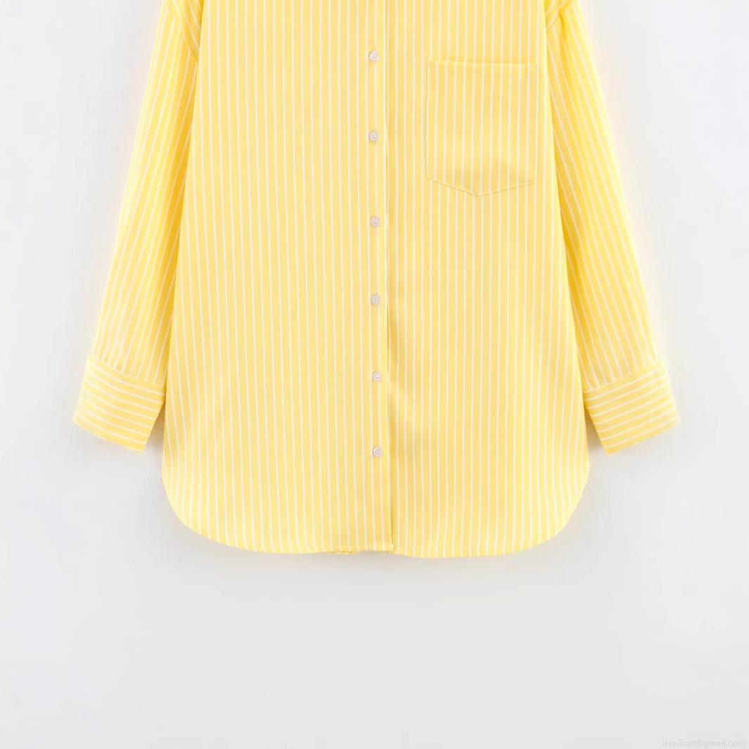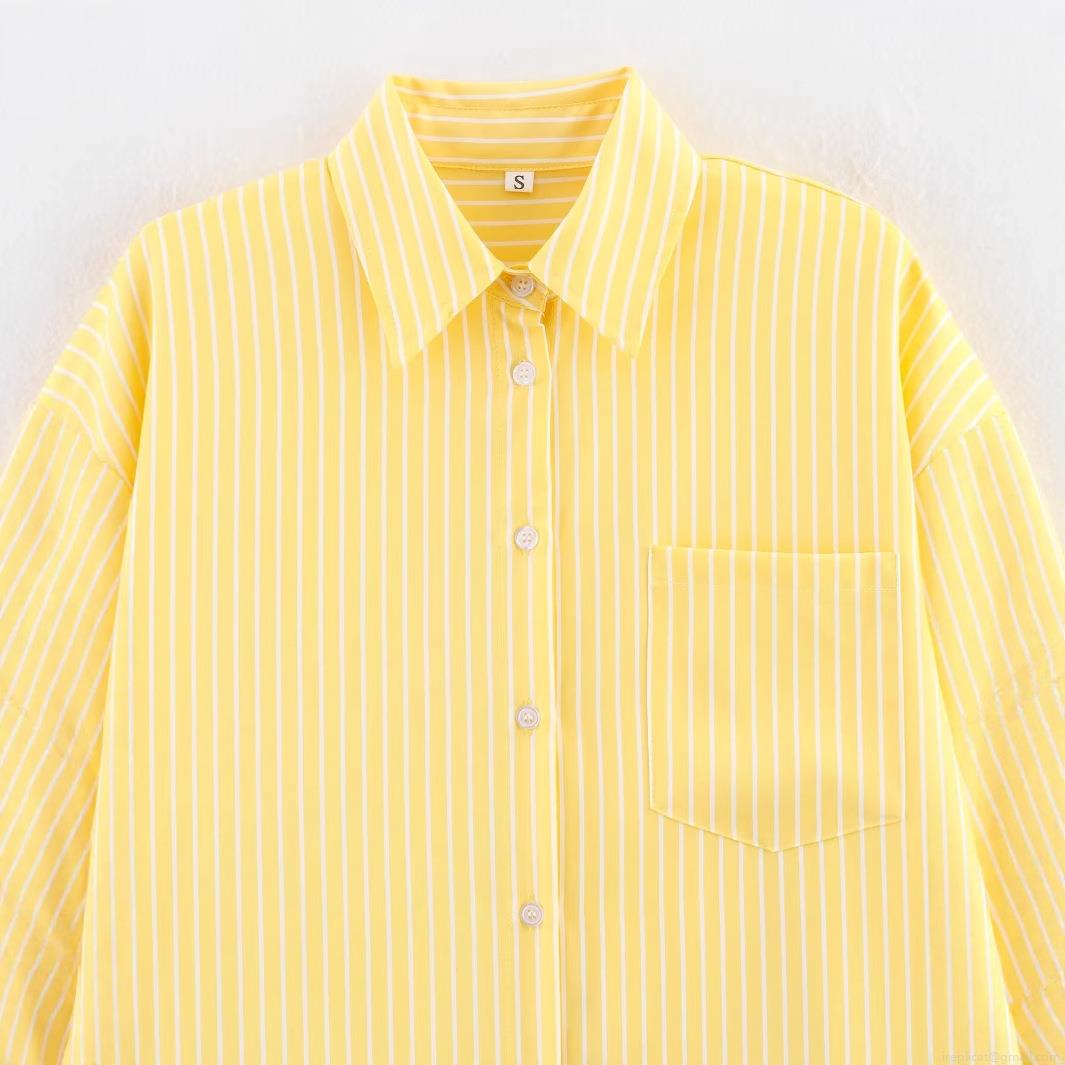 • Women Casual Yellow White Vertical Striped Shirt Long Sleeve Button Down Blouse With Chest Pocket Loose Fit Soft Polyester Tops For Daily Vacation Spring Autumn Lady