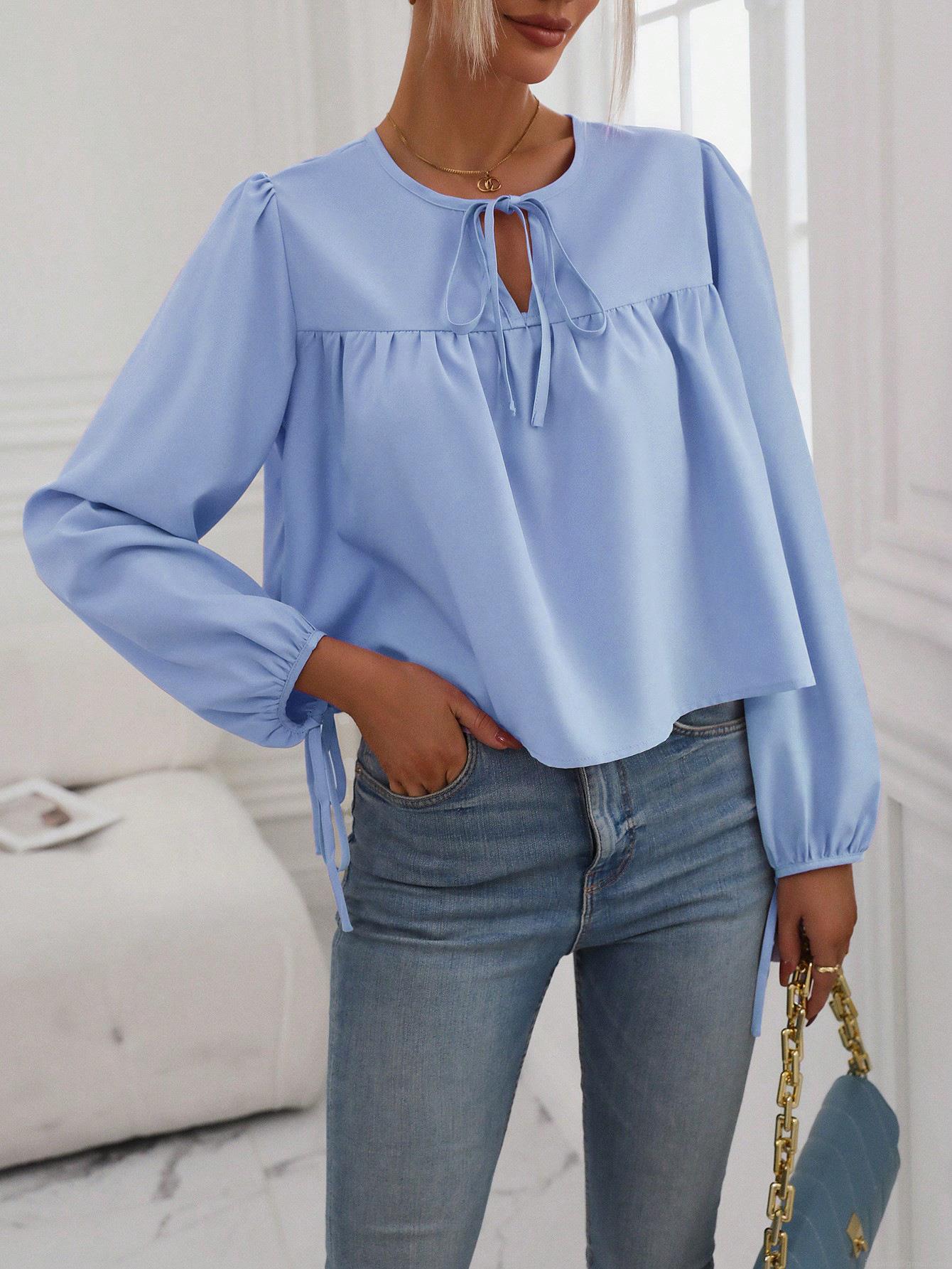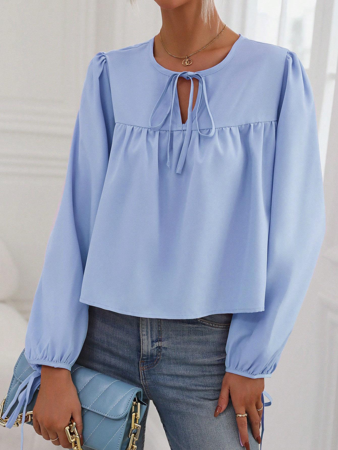 Women Elegant 100% Polyester Chiffon Blouse Tie-Neck Long Bubble Sleeve Ruffle Loose Fit Casual Tops For Daily Dating