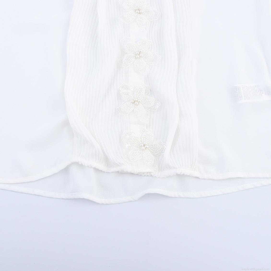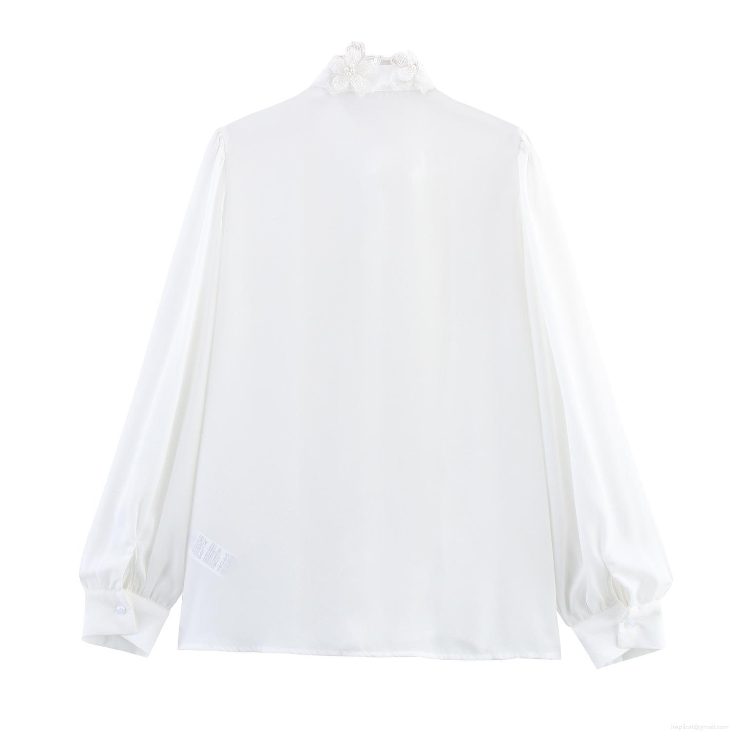 • Women Elegant 3D Flower Pleated Blouse Polyester Chiffon Long Puff Sleeve Shirt With Lace Collar Pearl Detail Solid White Intellectual Commuting Party Ladies Top