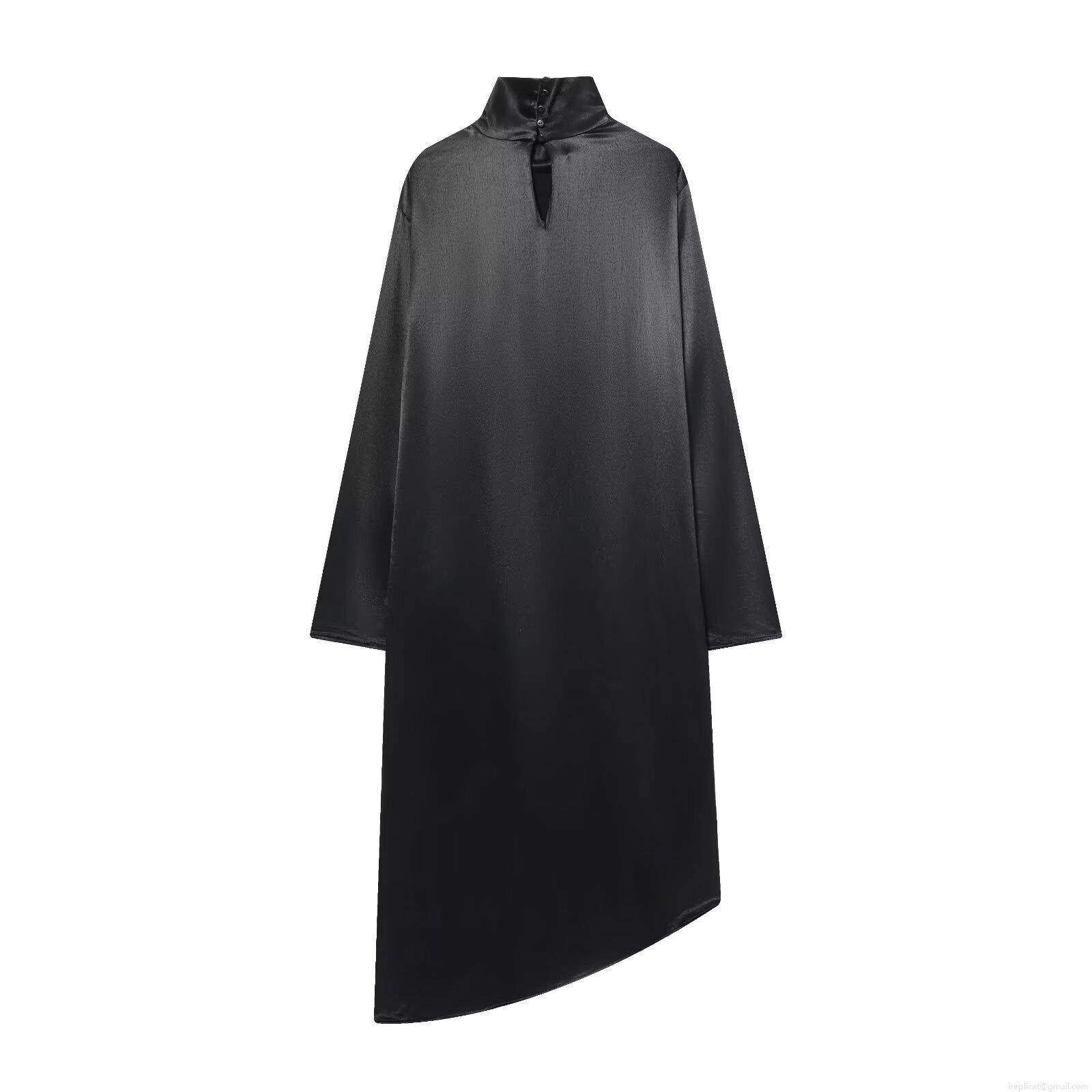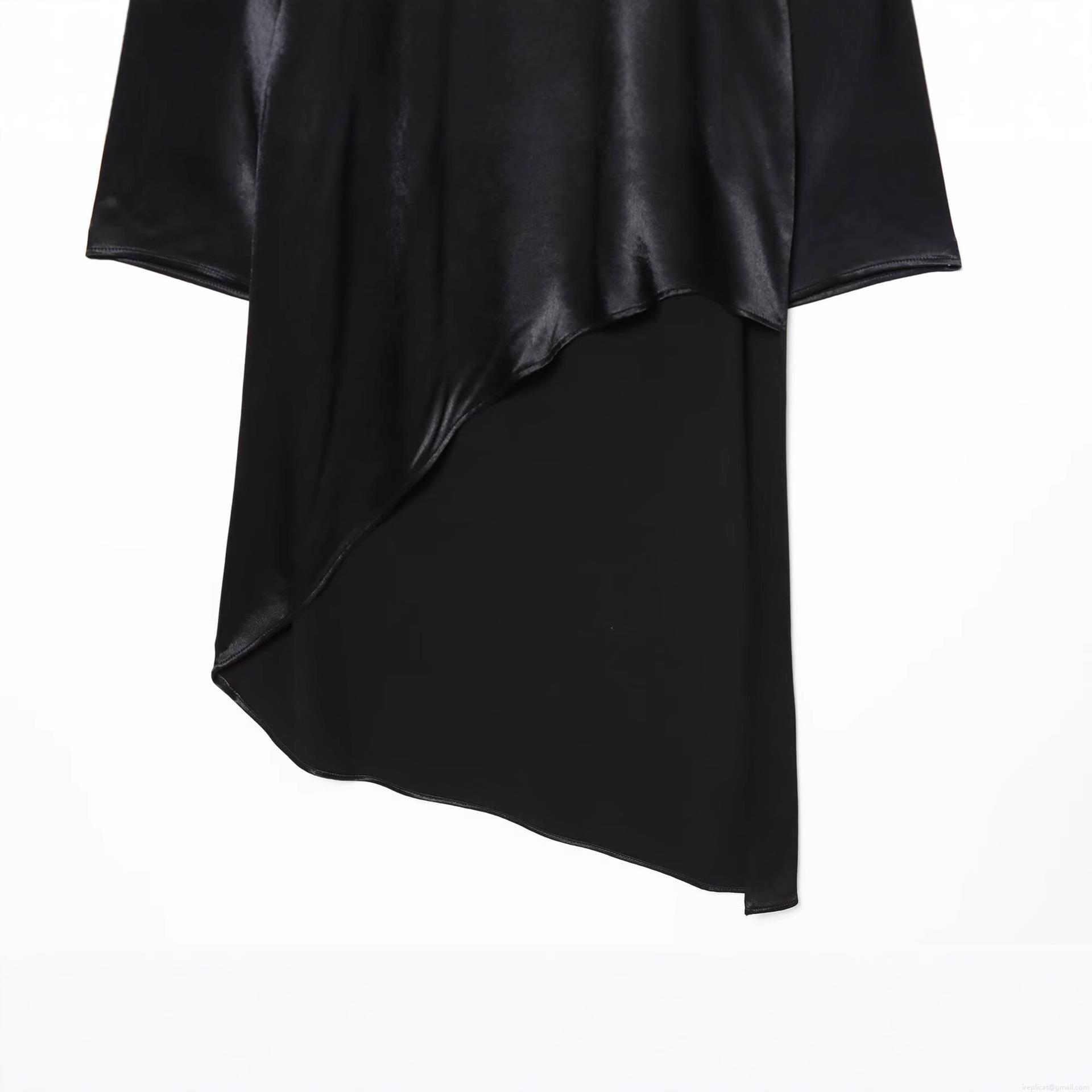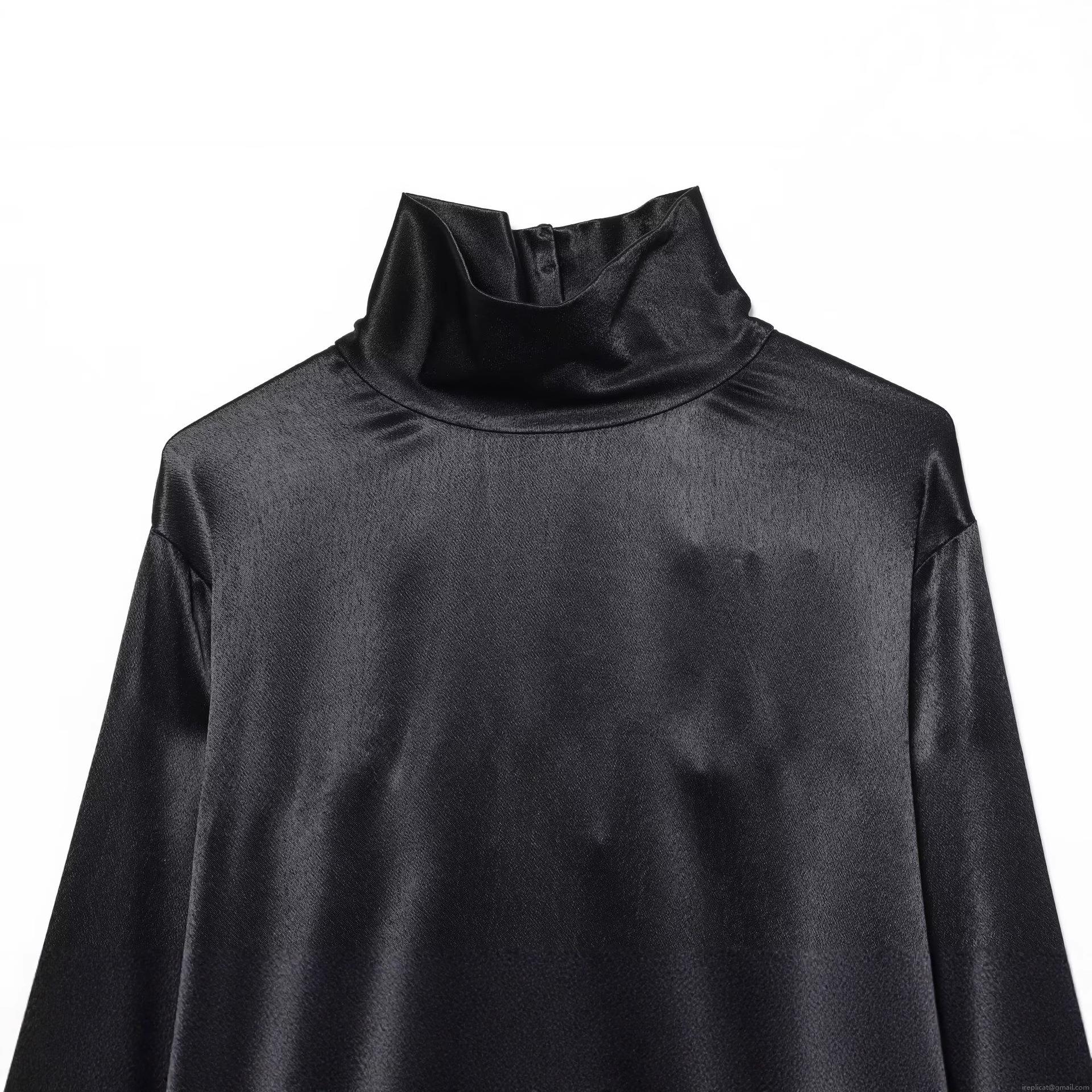 • Women Elegant Black Satin Asymmetric Shirt Mock Neck Long Sleeve Cutout Pullover Blouse Longline Spliced Fashion Top For Party Evening Daily