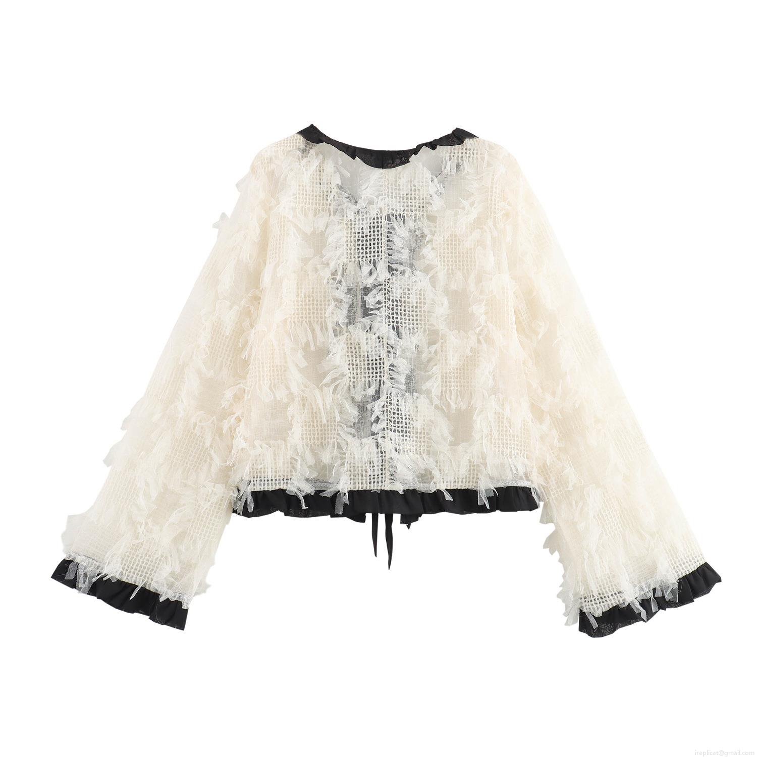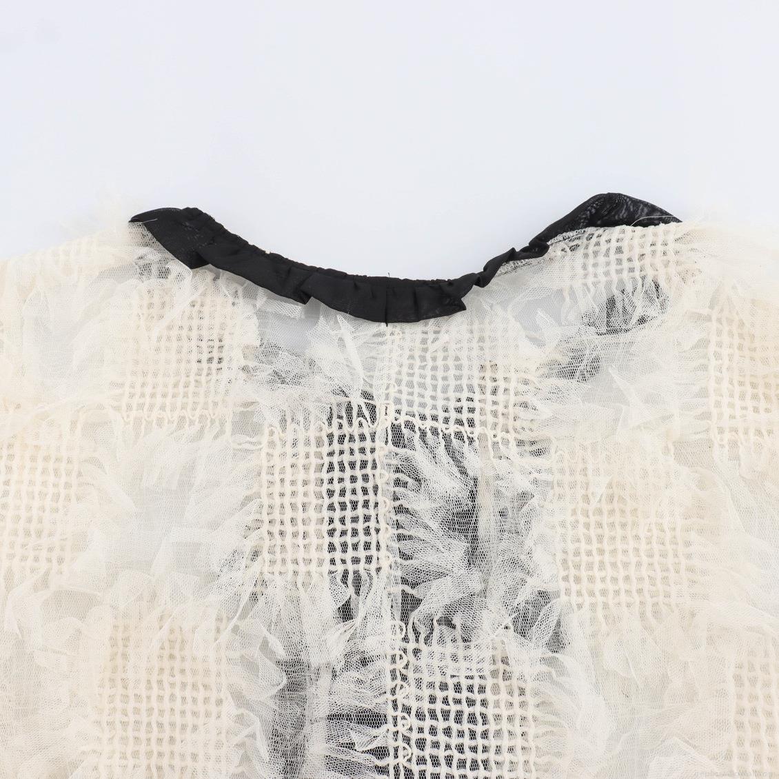 • Women Elegant French Style Short Jacket Blouse Lace Mesh Feather Fringe Top With Black Bow Tie Ruffle Trim Sweet Long Sleeve Outerwear For Party Date Night