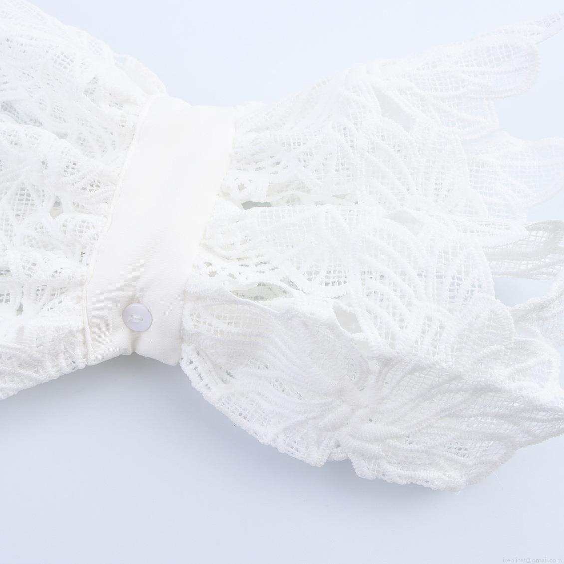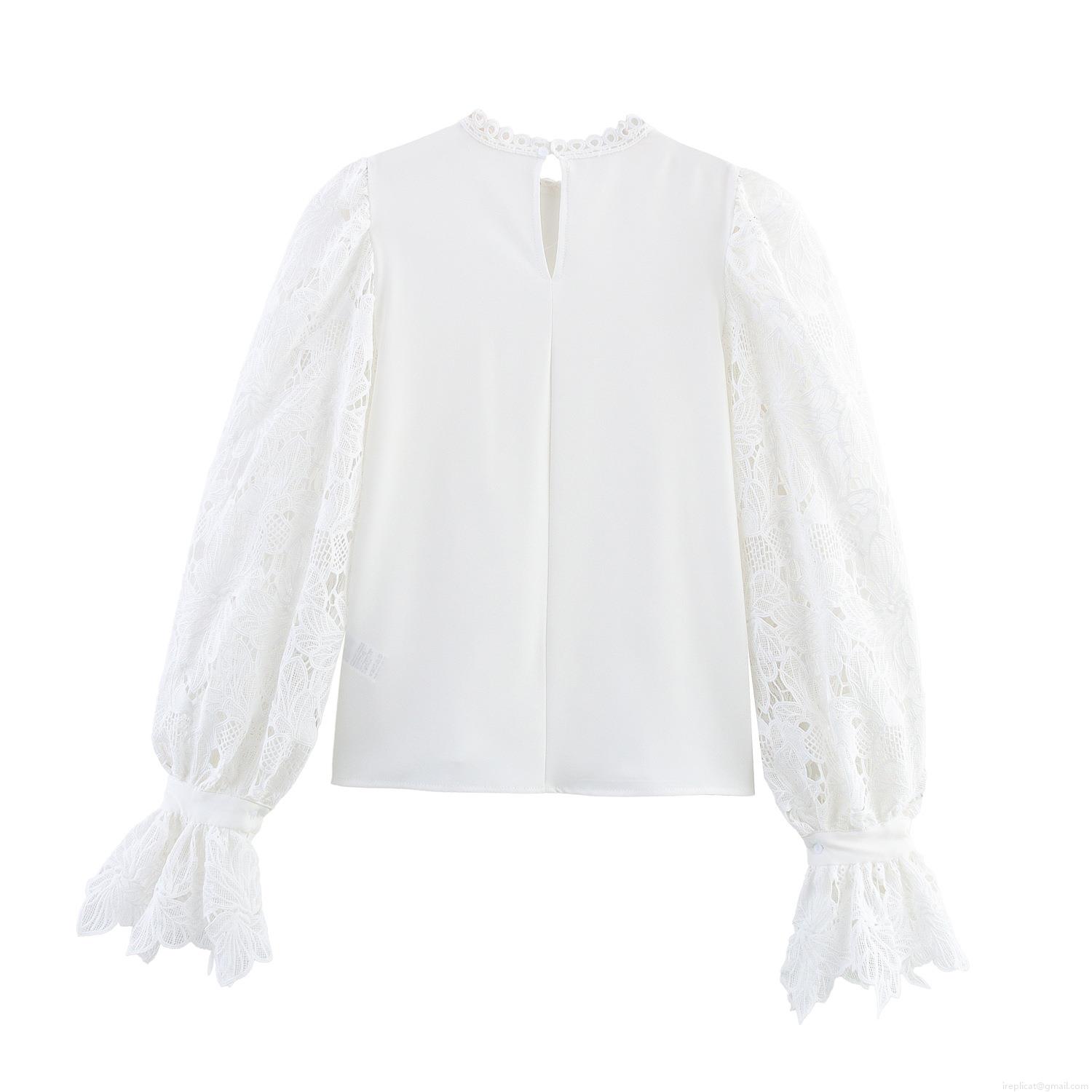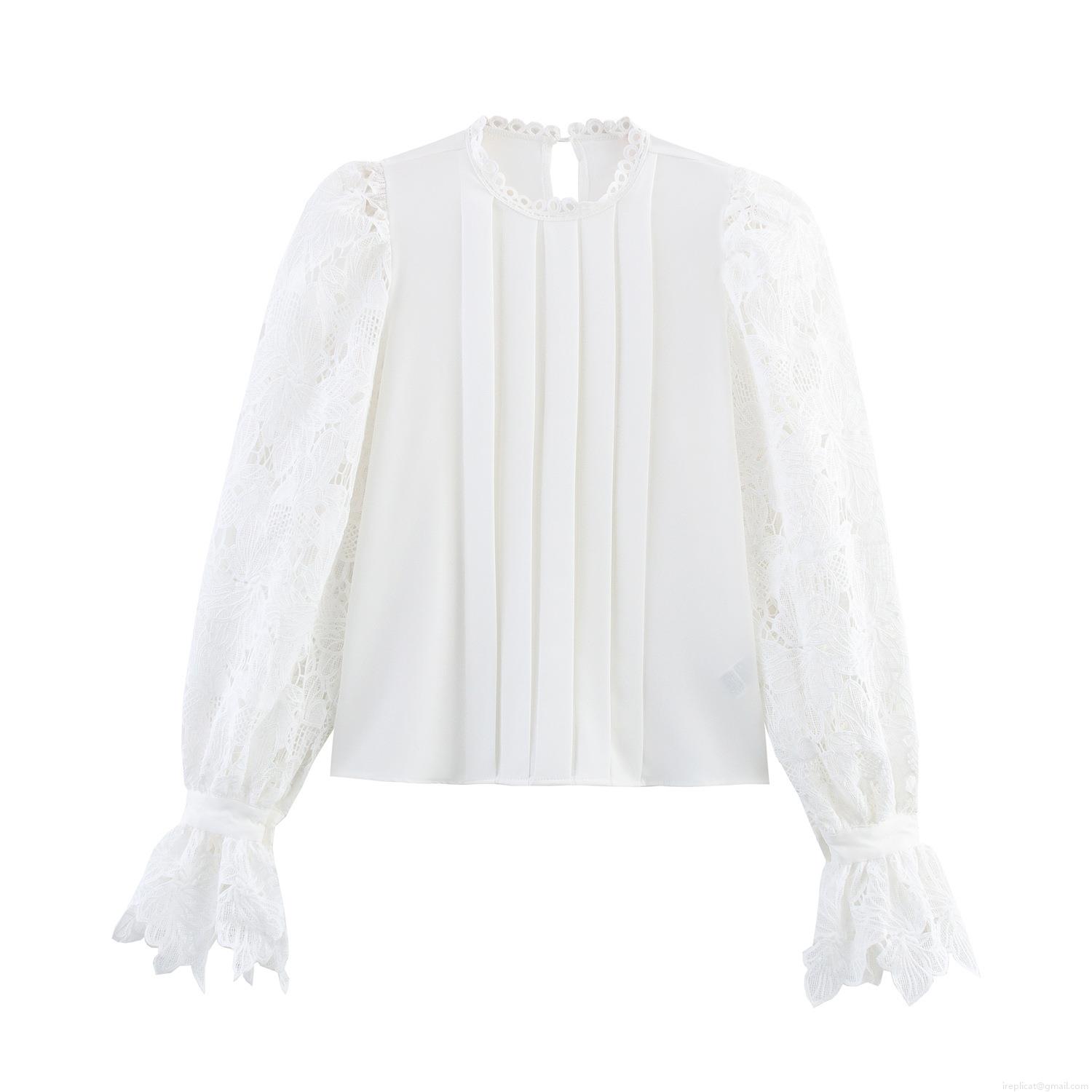 • Women Elegant Lace Patchwork Blouse Long Flare Sleeve Pleated Round Neck Top Solid White Polyester Commuter Pullover Shirts for Women